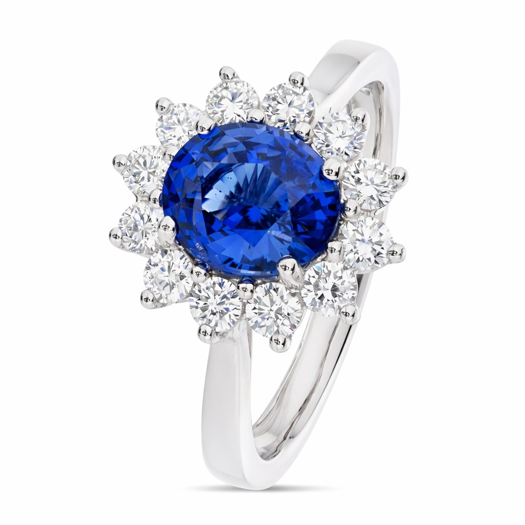 A brand-new, unused, certified natural diamond & blue sapphire gemstone cluster ring, set with an oval mixed-cut blue sapphire at the centre & brilliant cut diamonds in a halo setting, set in platinum.