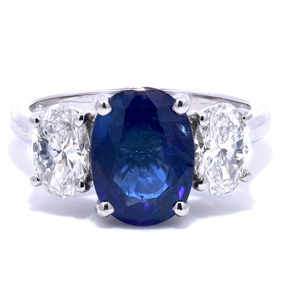 A brand-new, unused, certified natural diamond & blue sapphire three-stone cluster ring, with one oval-cut blue sapphire gemstone at the centre & two oval-cut diamonds to the sides, set in platinum.