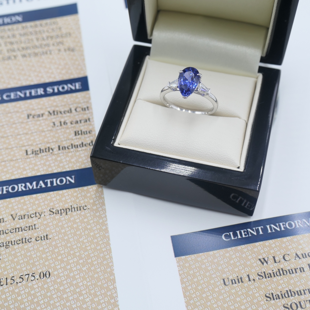 A brand-new, unused three-stone cluster ring crafted in certified platinum, this exceptional piece features a 3.16ct pear mixed-cut natural blue sapphire at its centre. The sapphire displays a rich, vibrant blue hue, beautifully complemented by two tapered baguette-cut natural diamonds set on either side. The diamonds, weighing a total of 0.24ct, are graded F–G in colour with VS1–VS2 clarity, offering crisp brilliance and precision that enhance the sapphire’s elegance. The platinum setting provides both strength and refinement, allowing the gemstones to shine with maximum impact.