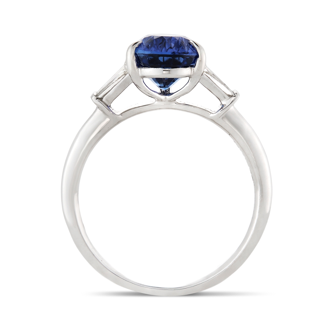 A brand-new, unused, certified platinum natural diamond & blue sapphire gemstone three-stone cluster ring, set with one pear mixed-cut blue sapphire gemstone at the centre & two tapered baguette-cut diamonds to the sides.