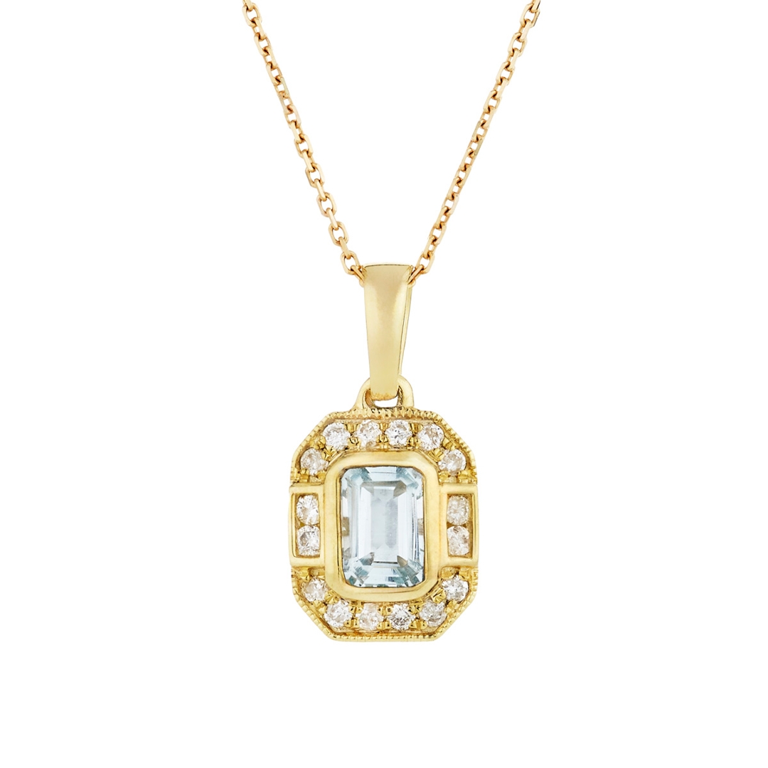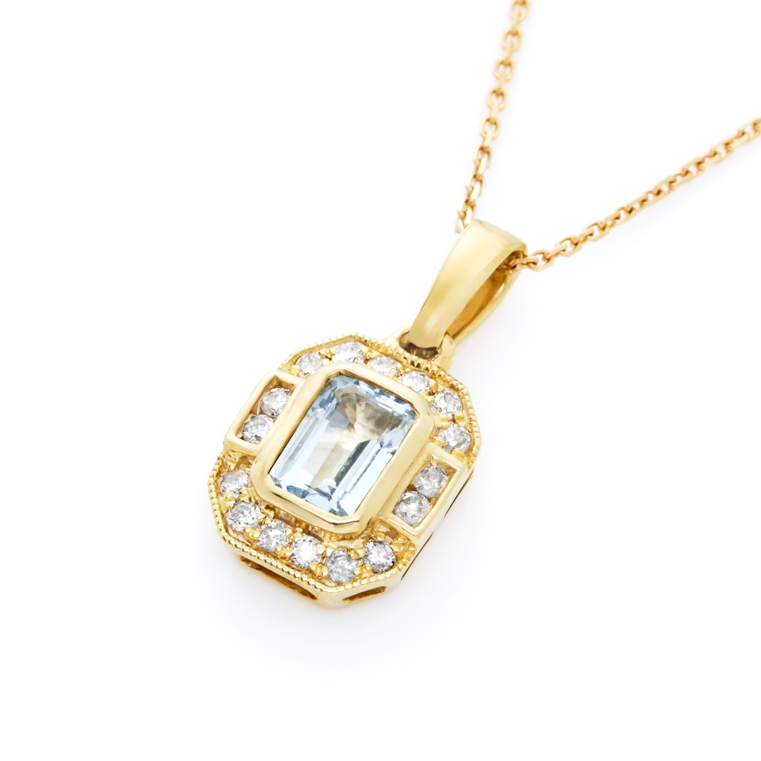 A brand-new, unused, certified natural diamond & blue topaz asscher-shaped cluster pendant, with one octagonal step-cut blue topaz gemstone at the centre & a cluster of brilliant-cut diamonds in a halo setting, in 9ct yellow gold.