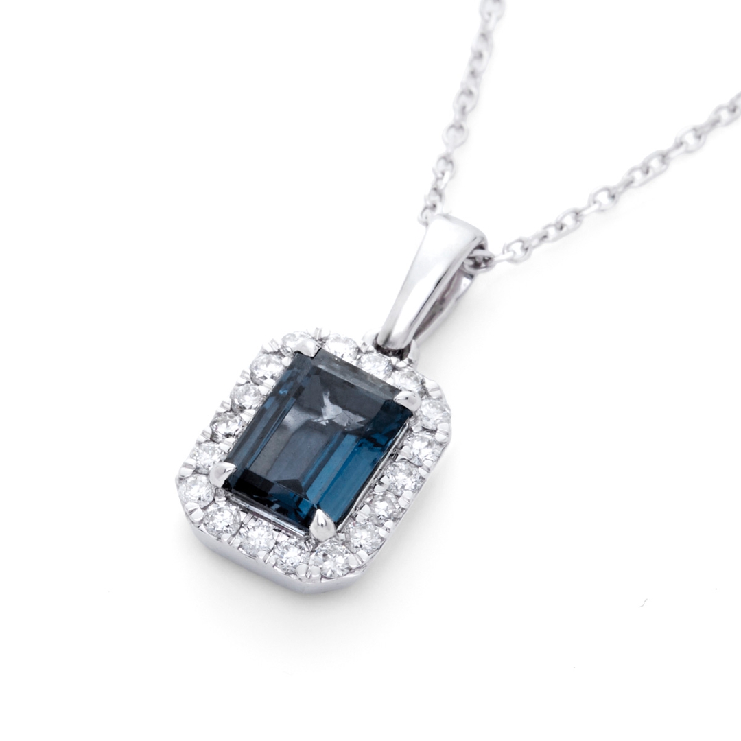 - > Natural Blue Topaz 1.15ct & Diamond 0.20ct Asscher Shaped Cluster Pendant