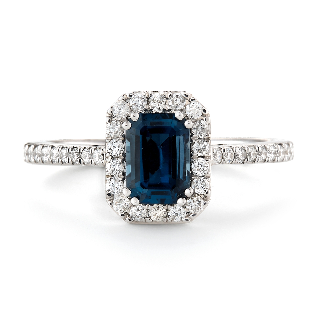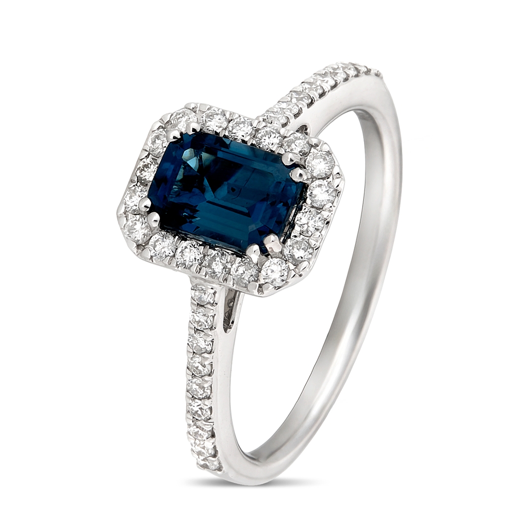 - > Natural Blue Topaz 1.18ct & Diamond 0.39ct Emerald Shaped Cluster Ring