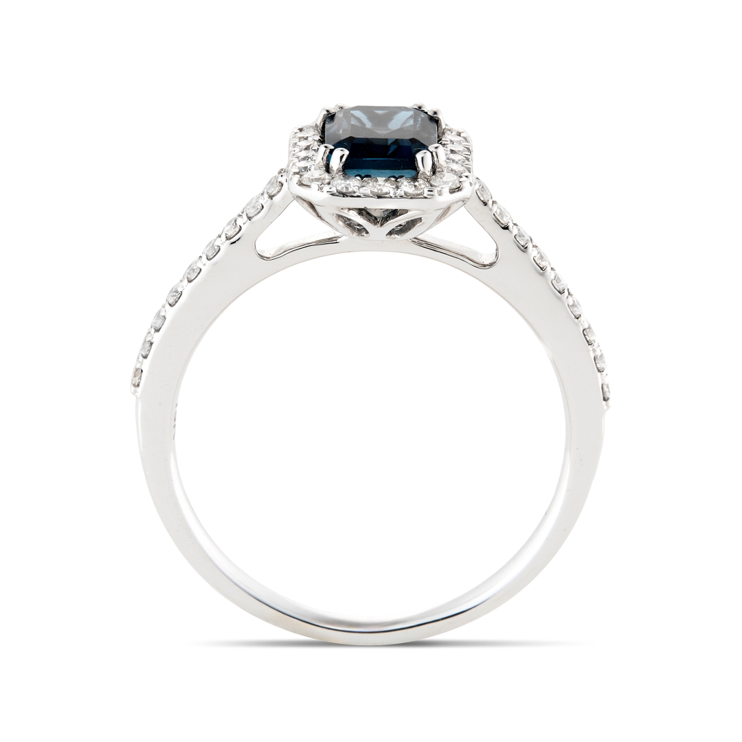 A brand-new, unused ring crafted in 18ct white gold, this certified cluster design showcases a 1.18ct octagonal step-cut natural blue topaz at its centre. Its rich blue tone is elegantly framed by a halo of brilliant-cut natural diamonds, with further diamonds set along the shoulders for added radiance and refinement. Together, the gemstones create a balanced composition of bold colour and sparkling brilliance, while the cool lustre of white gold enhances their vibrancy. The diamonds, totalling 0.39ct, are graded F–G in colour and SI1–SI2 in clarity, ensuring excellent light performance and eye-catching fire.