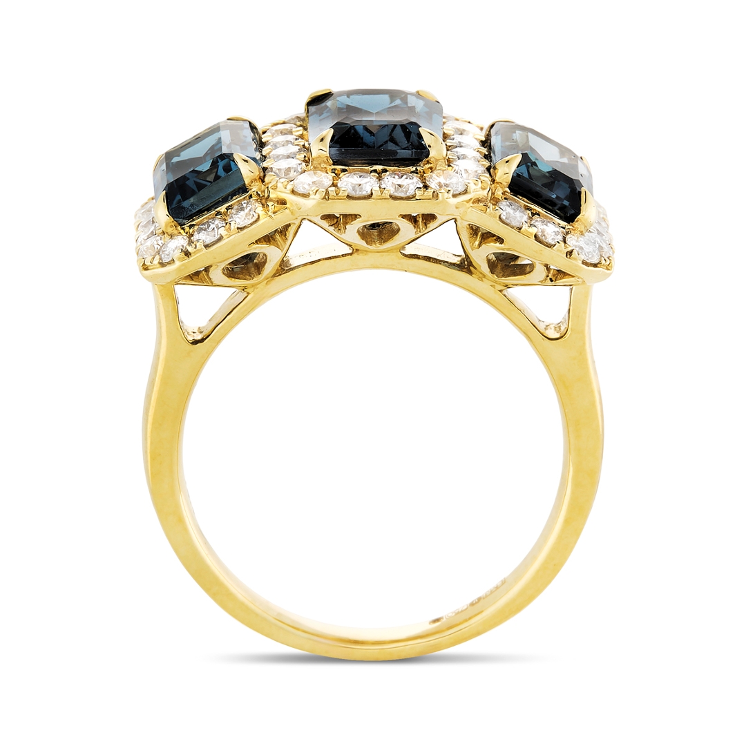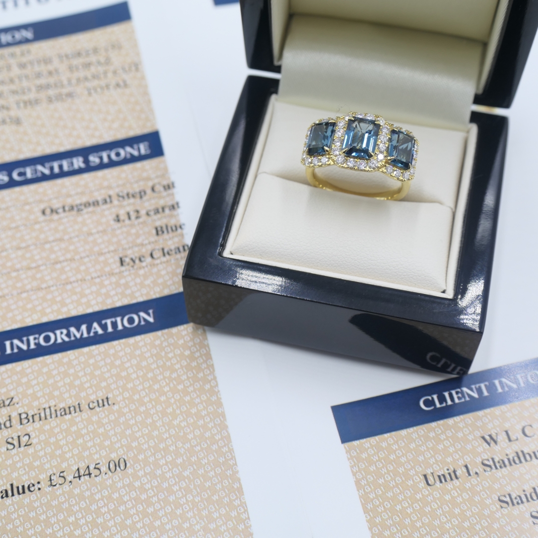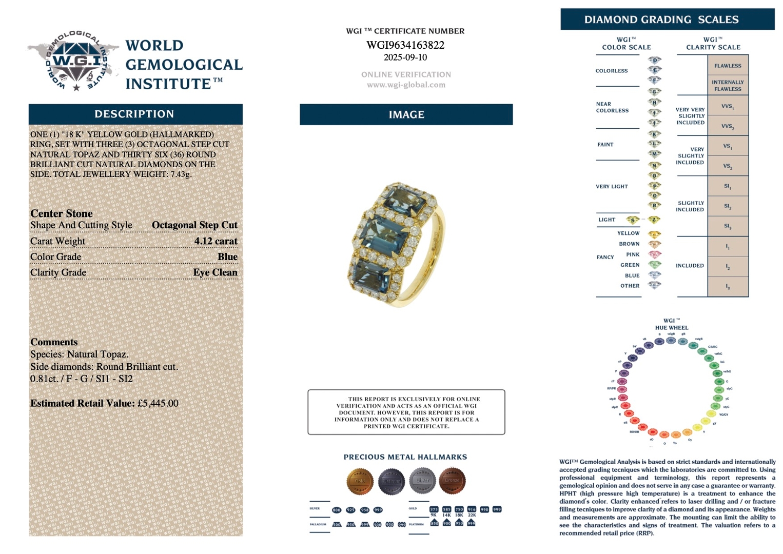A brand-new, unused trio cluster ring crafted in certified 18ct yellow gold, this impressive design is set with three octagonal step-cut natural blue topaz gemstones weighing a total of 4.12ct. The striking blue hue of the topaz is enriched by a halo of natural brilliant-cut diamonds surrounding each stone, with additional diamonds set along the shoulders to enhance its brilliance. The diamonds, totalling 0.81ct, are graded F–G in colour with SI1–SI2 clarity, delivering an exceptional sparkle that contrasts beautifully with the depth of the blue topaz. The rich warmth of yellow gold complements the stones perfectly, making this ring a statement of elegance and refinement.