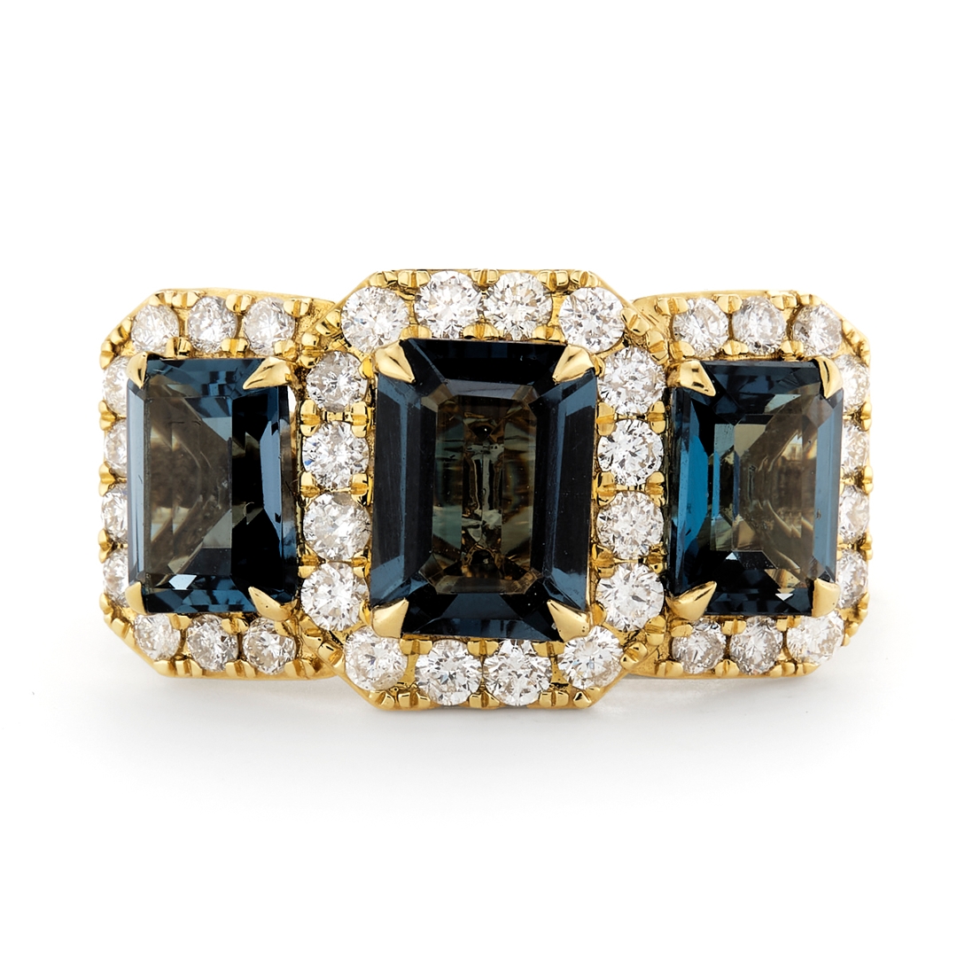- > Natural Blue Topaz 4.12ct & Diamond 0.81ct Emerald Shaped Trio Cluster Ring