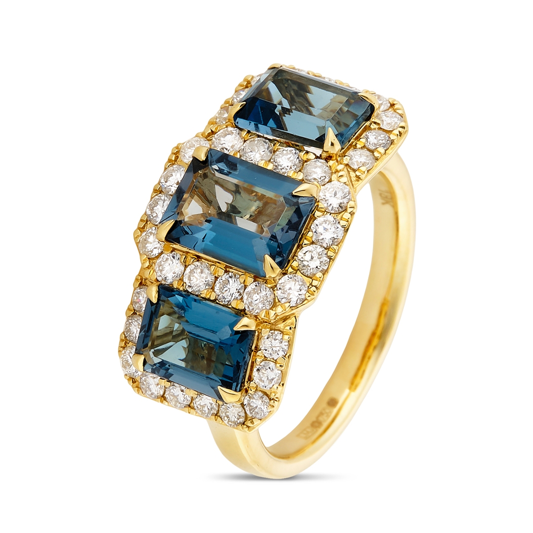 A brand-new, unused, certified 18ct yellow gold natural diamond & blue topaz gemstone emerald-shaped trio cluster ring, set with three octagonal step-cut blue topaz gemstones at the centre & a cluster of brilliant-cut diamonds in a halo setting on & the shoulders.
