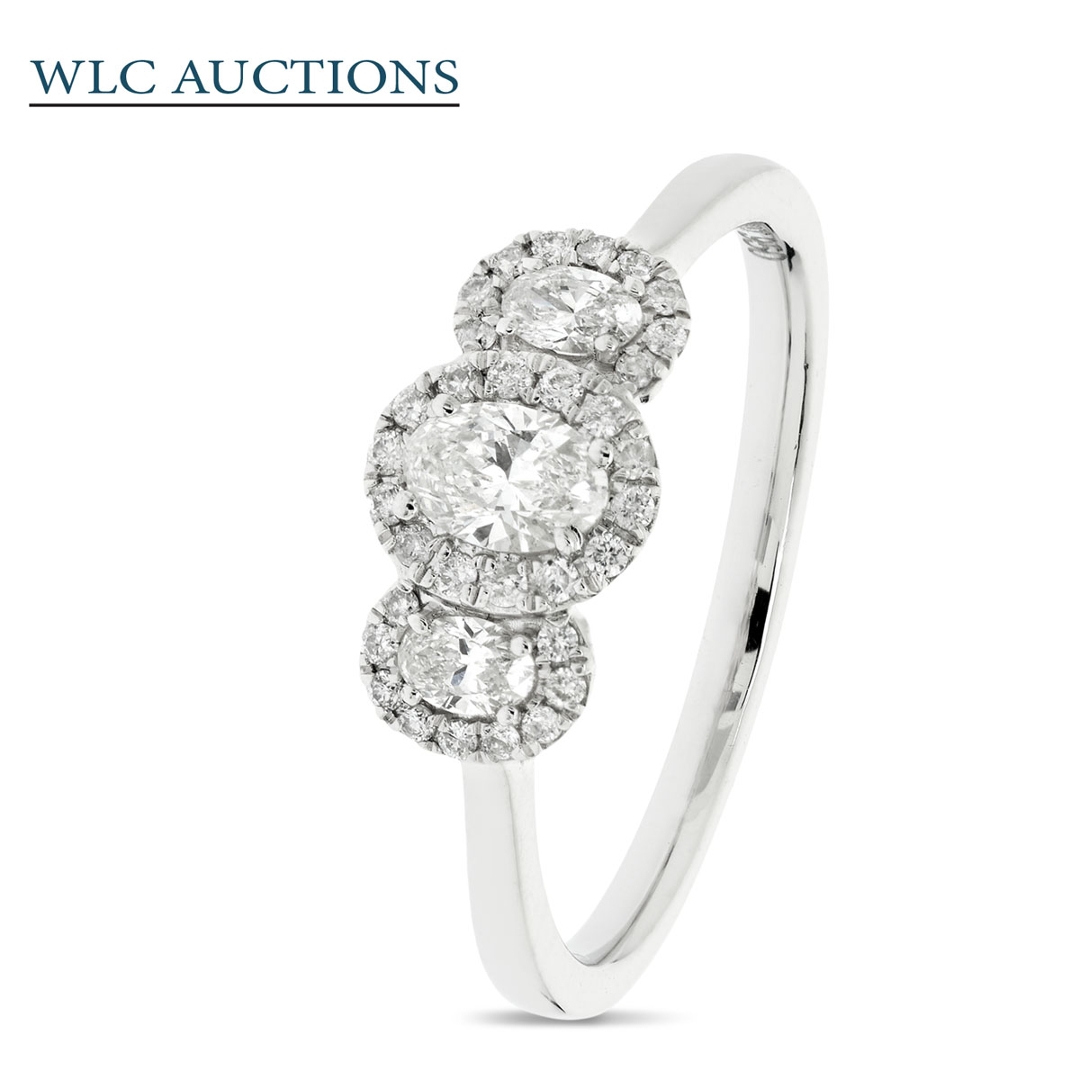 A brand-new, unused, certified natural diamond oval-shaped trio cluster ring, with three oval-cut diamonds to the centre & a cluster of brilliant-cut diamonds in a halo setting, set in platinum.