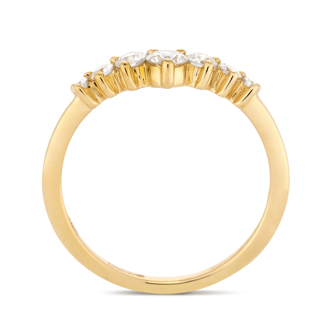 A brand-new, unused certified natural diamond wishbone eternity ring, set with seven brilliant-cut diamonds in 18ct yellow gold. With a total diamond weight of 0.47ct, the design offers a graceful and distinctive silhouette, with the wishbone shape naturally curving to follow the finger or sit neatly alongside another ring. The evenly spaced diamonds create a refined and continuous line of sparkle, enhanced by the warm tone of the yellow gold, which adds depth and a timeless character.