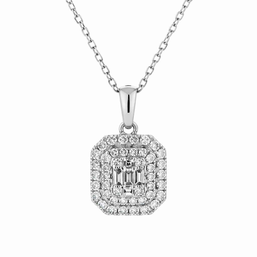 A brand-new, unused, certified natural diamond, asscher-shaped cluster pendant, set with a cluster of baguette-cut & brilliant-cut diamonds, set in 9ct white gold.