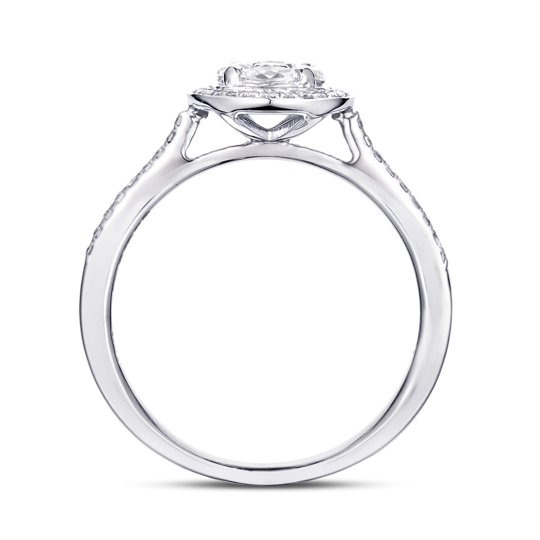 The cluster of diamonds at the centre of the ring weighs 0.43 carats, showcasing a harmonious blend of marquise and brilliant cuts that add depth and dimension to the design. Each diamond is carefully selected for its exceptional clarity (graded SI1) and enchanting colour (graded G), ensuring a mesmerising display of light and brilliance.