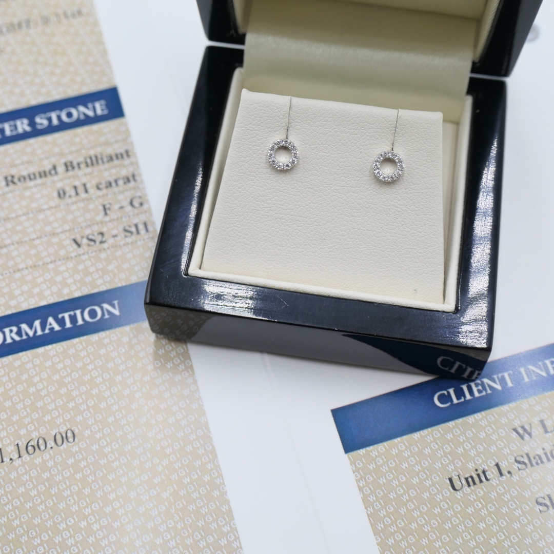 A brand-new, unused, certified pair of 18ct white gold, natural diamond, circle-shaped cluster earrings. These refined pieces combine timeless elegance with delicate sparkle. Each earring is adorned with a carefully set cluster of brilliant-cut natural diamonds, totalling 0.11ct. With diamonds graded VS2 to SI1 in clarity and F to G in colour, the stones exhibit excellent brightness and clarity, delivering a clean, radiant shine that catches the light effortlessly.