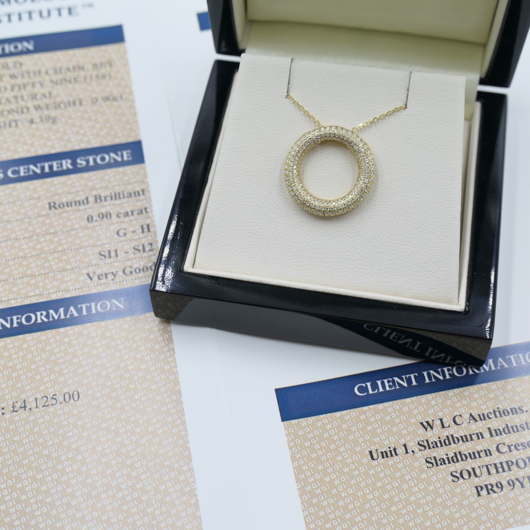 A brand-new, unused, certified 18ct yellow gold natural diamond circle-shaped cluster pendant, expertly set with 0.90 carats of round brilliant-cut natural diamonds. The open circle design exudes timeless sophistication, with each diamond meticulously placed to create a seamless display of radiance and depth. The warm hue of yellow gold perfectly complements the near-colourless G–H diamonds, while the SI1–SI2 clarity ensures a lively sparkle that dances beautifully with every movement. This pendant embodies refined craftsmanship, making it an exquisite piece for both everyday elegance and special occasions. Weighing 4.39 grams.