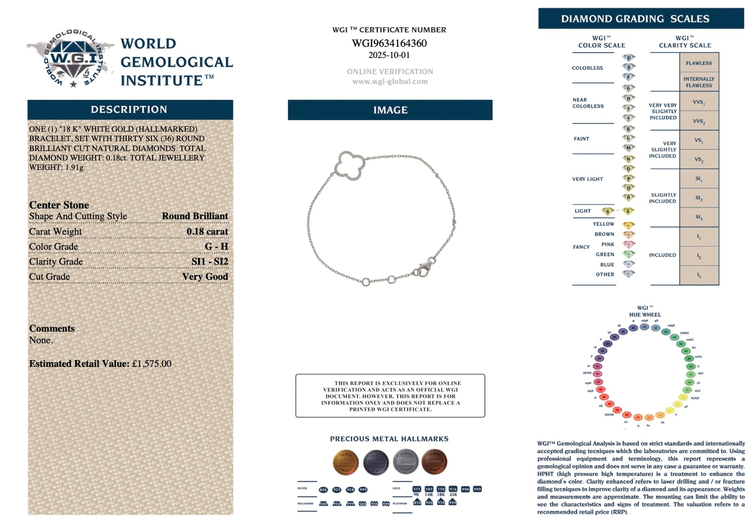 A brand-new, unused 18ct white gold diamond bracelet showcasing the timeless appeal and natural beauty of earth-formed diamonds. Crafted with exceptional precision, this elegant piece features a delicate chain adorned with a stunning four-leaf clover motif, symbolising luck and love. The clover is beautifully set with thirty-six round brilliant-cut natural diamonds, totalling 0.18ct, each carefully selected for its sparkle and radiance. Graded G–H in colour and SI1–SI2 in clarity, the diamonds offer a soft, captivating brilliance that complements the fine white gold setting perfectly.