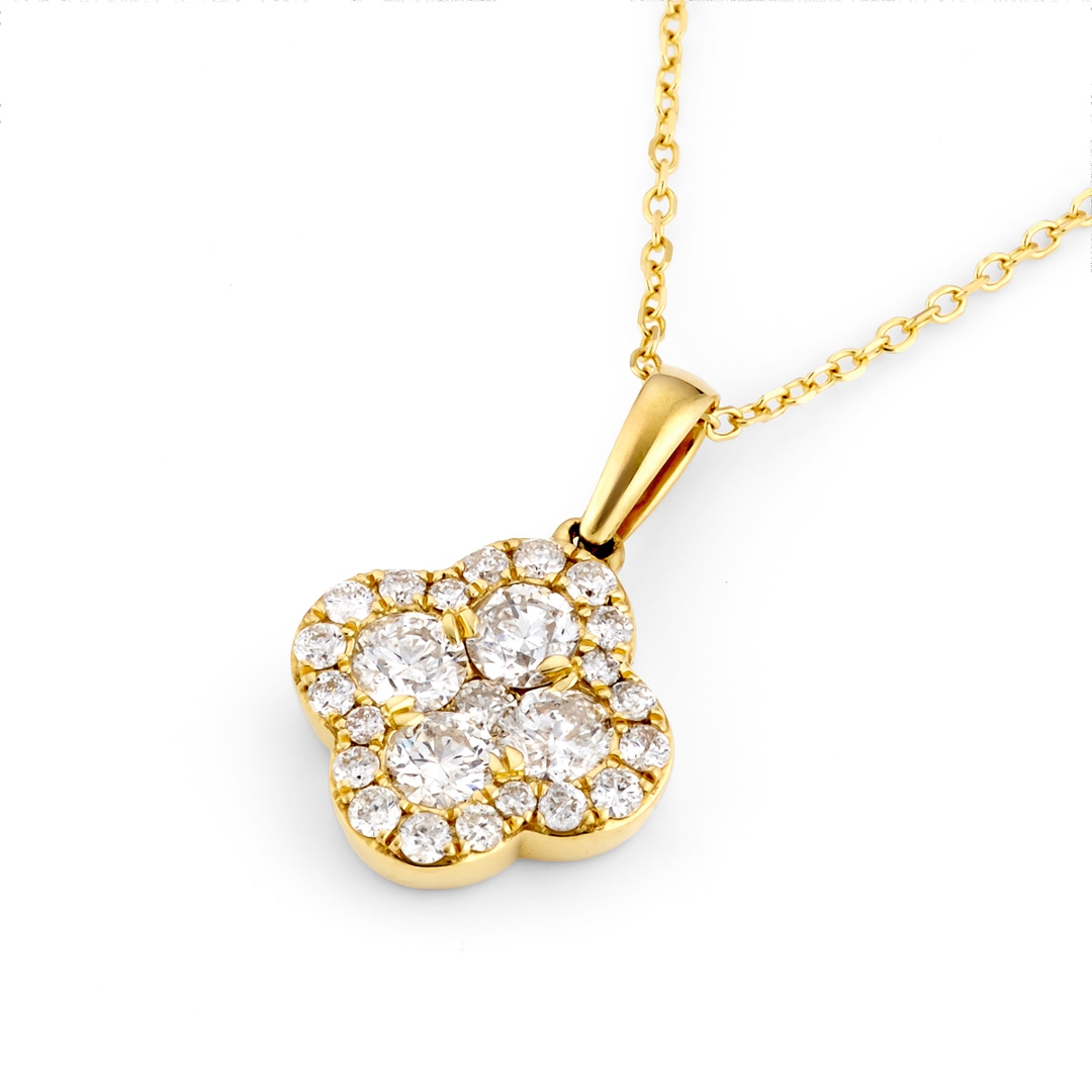 A brand-new, unused, certified natural diamond clover-shaped cluster pendant, set with five brilliant cut diamonds to the centre & a cluster of brilliant cut diamonds in a halo setting, set in 18ct yellow gold.
