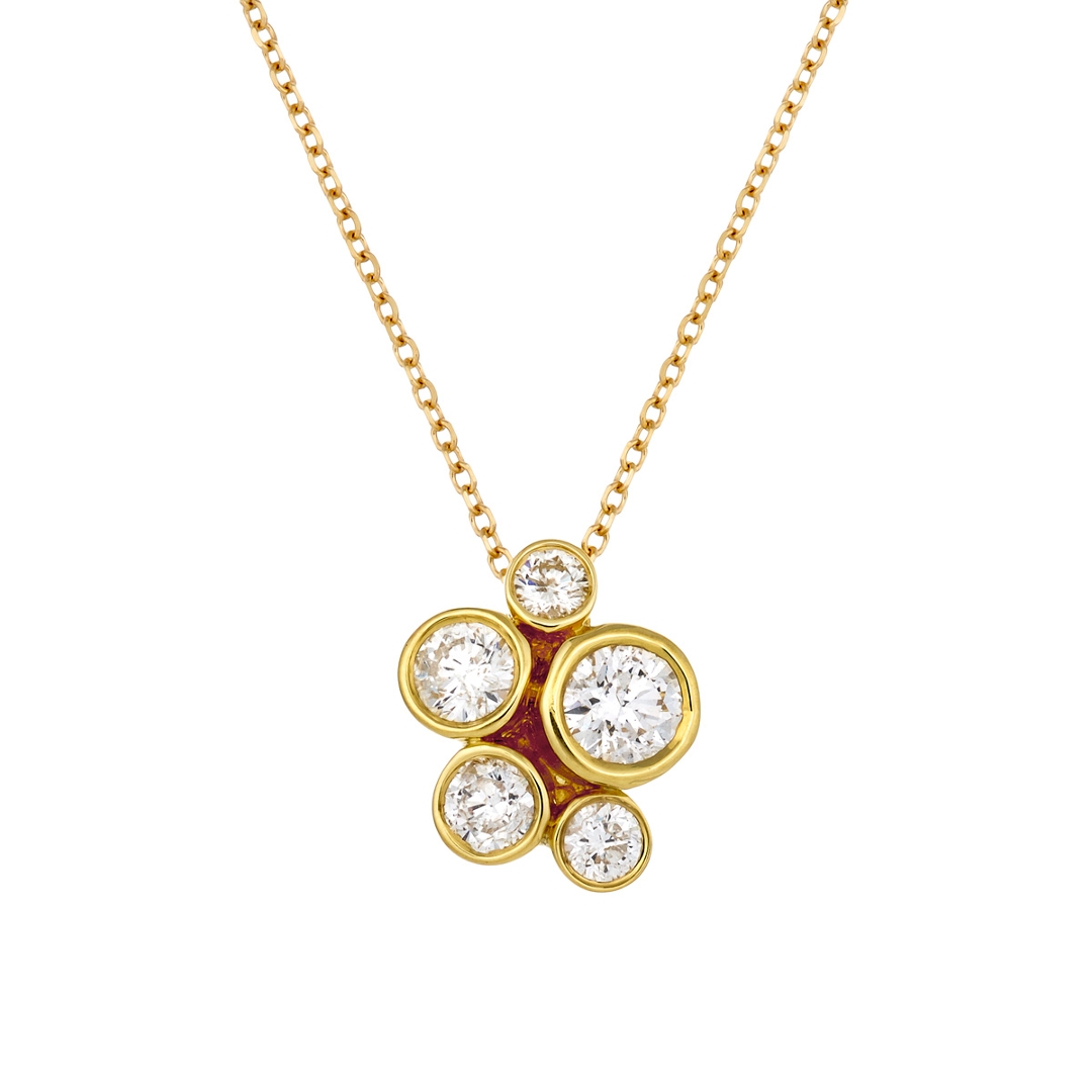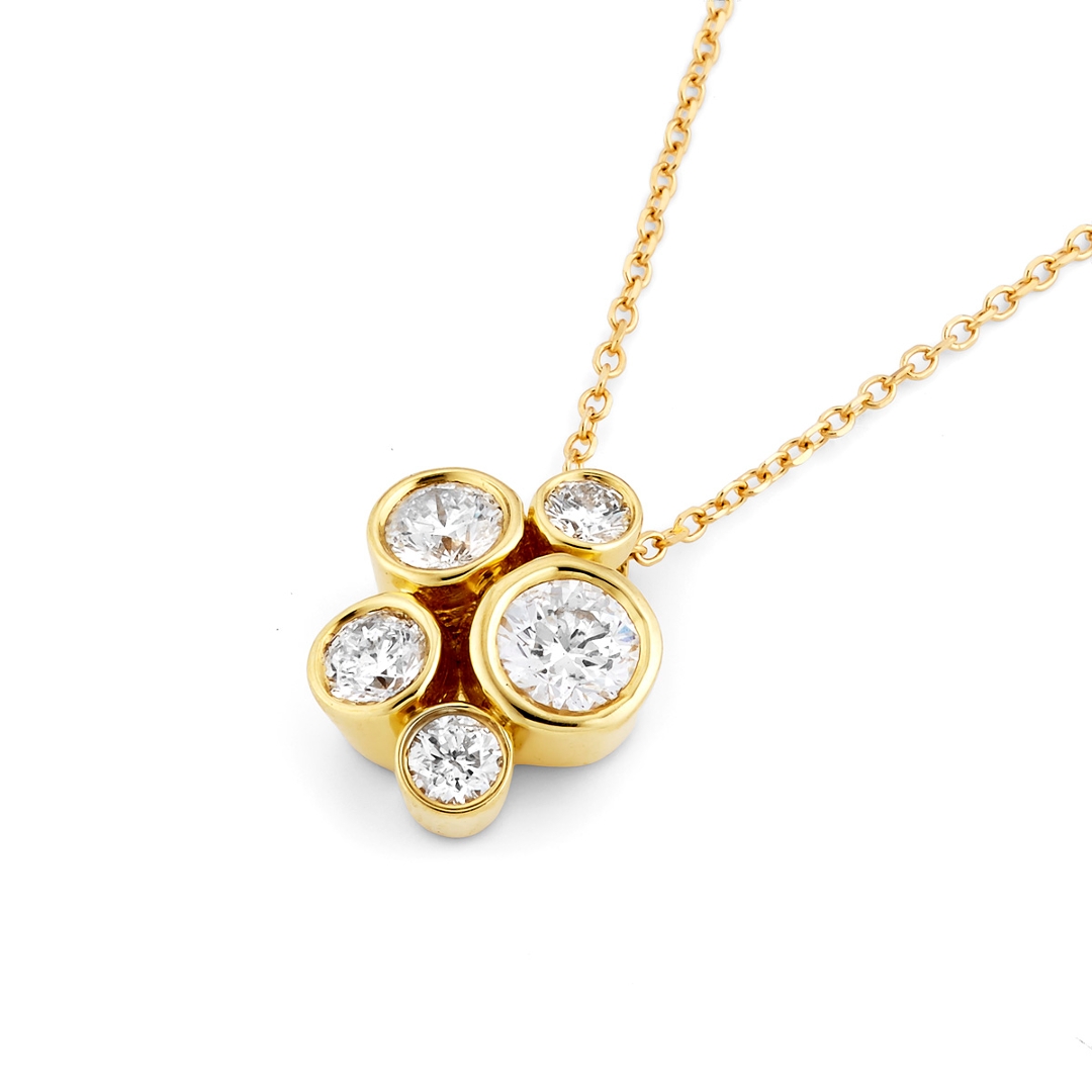 A brand-new, unused, certified 18ct yellow gold natural diamond cluster pendant, beautifully crafted with five round brilliant-cut diamonds totalling 0.85 carats. Each diamond exhibits exceptional G–H colour and SI1–SI2 clarity, producing a luminous brilliance that captures the eye from every angle. The minimalist bezel setting in warm yellow gold enhances the individuality of each diamond while creating a harmonious balance of elegance and sophistication. This pendant embodies timeless craftsmanship and refined taste, offering a piece that feels both contemporary and classic in equal measure.