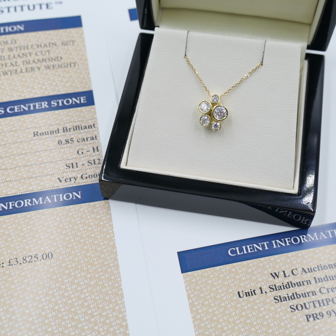 A brand-new, unused, certified 18ct yellow gold natural diamond cluster pendant, beautifully crafted with five round brilliant-cut diamonds totalling 0.85 carats. Each diamond exhibits exceptional G–H colour and SI1–SI2 clarity, producing a luminous brilliance that captures the eye from every angle. The minimalist bezel setting in warm yellow gold enhances each diamond's individuality while maintaining a harmonious balance of elegance and sophistication. This pendant embodies timeless craftsmanship and refined taste, offering a piece that is both contemporary and classic.