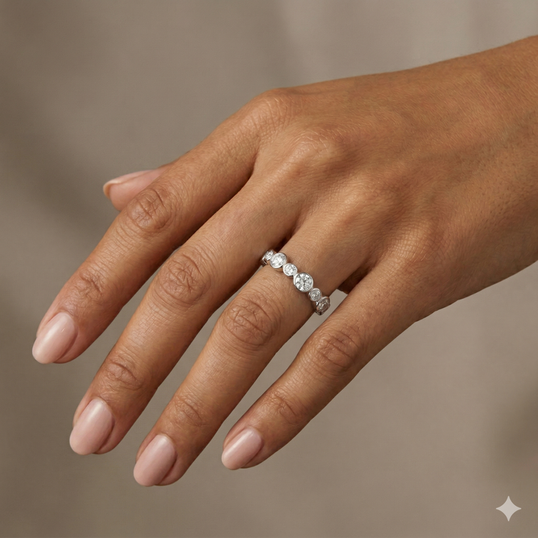 Crafted in platinum, the 4.59-gram setting enhances the diamonds’ luminosity with its cool, polished sheen. The design offers a graceful profile with enduring strength and sophistication, ensuring both comfort and security while being effortlessly elegant. Every detail has been crafted with precision to highlight the purity and natural beauty of each diamond, creating a ring that radiates understated luxury.