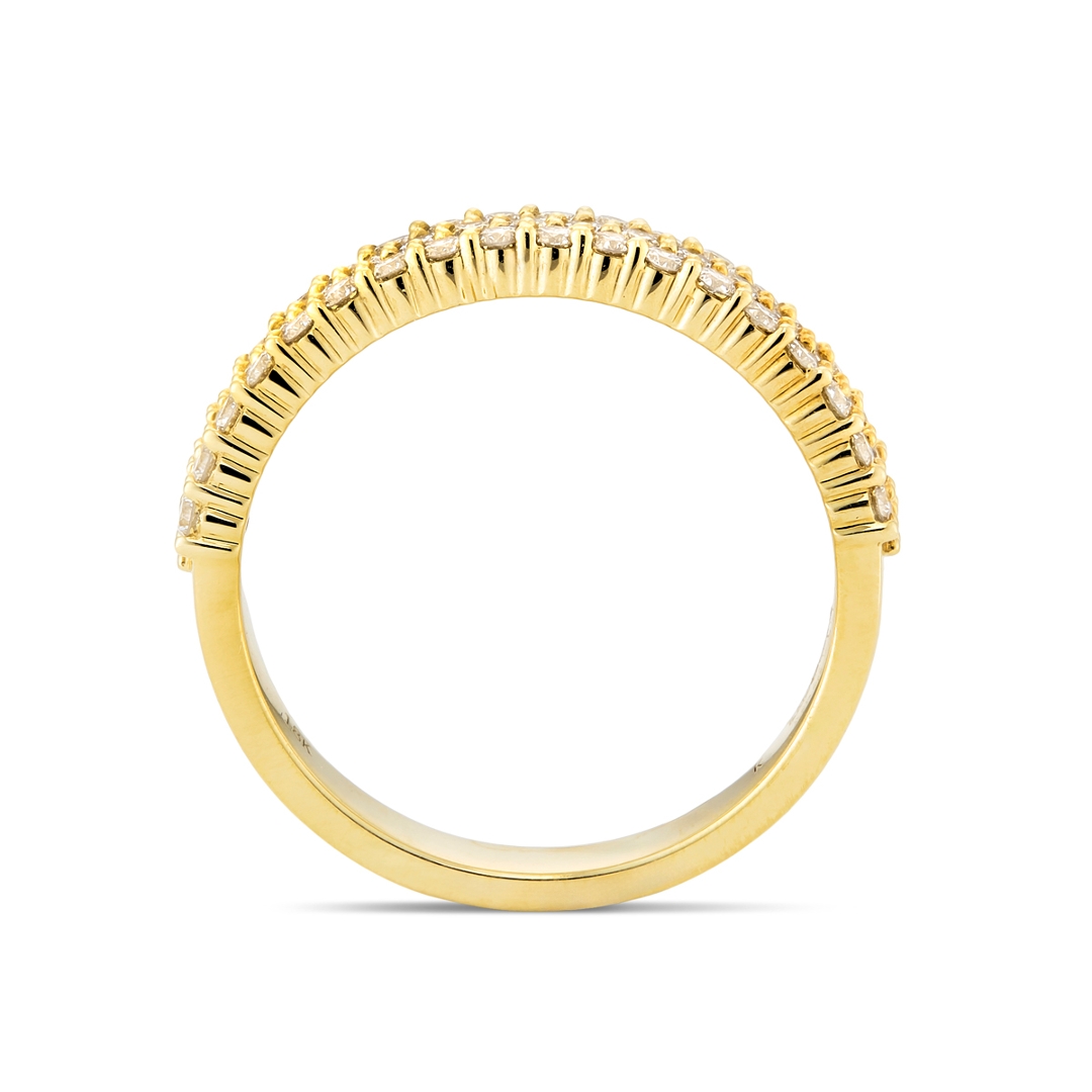 A brand-new, unused, certified natural diamond cluster ring, featuring a refined three-row arrangement of brilliant cut diamonds set in 18ct yellow gold. With a total diamond weight of 0.74ct, the design creates a compact yet eye-catching display of brilliance, with each row contributing to a layered effect that enhances the overall sparkle. The warm tone of the yellow gold setting provides a rich contrast, highlighting the brightness of the diamonds.