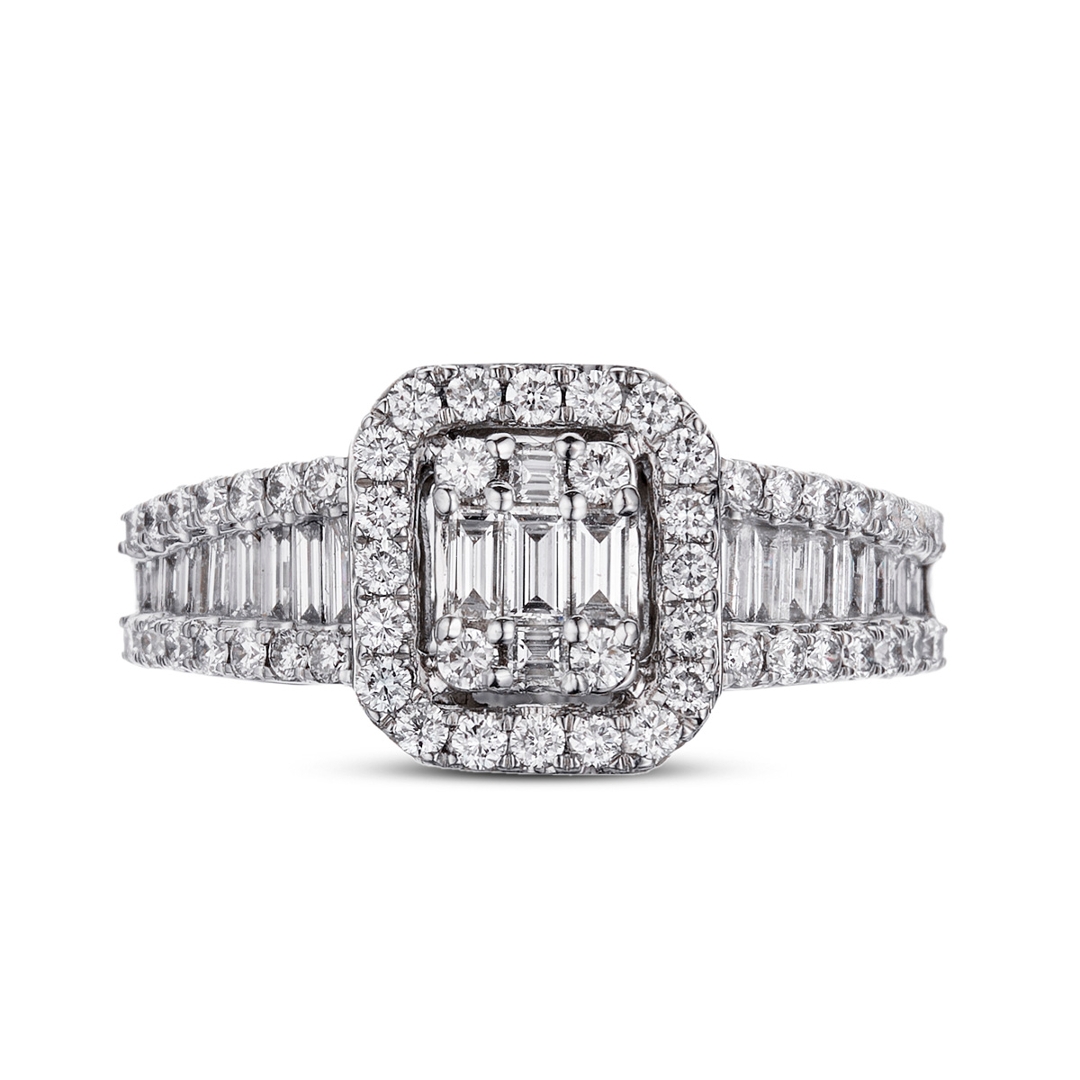 A brand-new, unused, certified natural diamond cluster ring, set with baguette-cut and brilliant-cut diamonds in the centre and on the shoulders, in 18ct white gold.