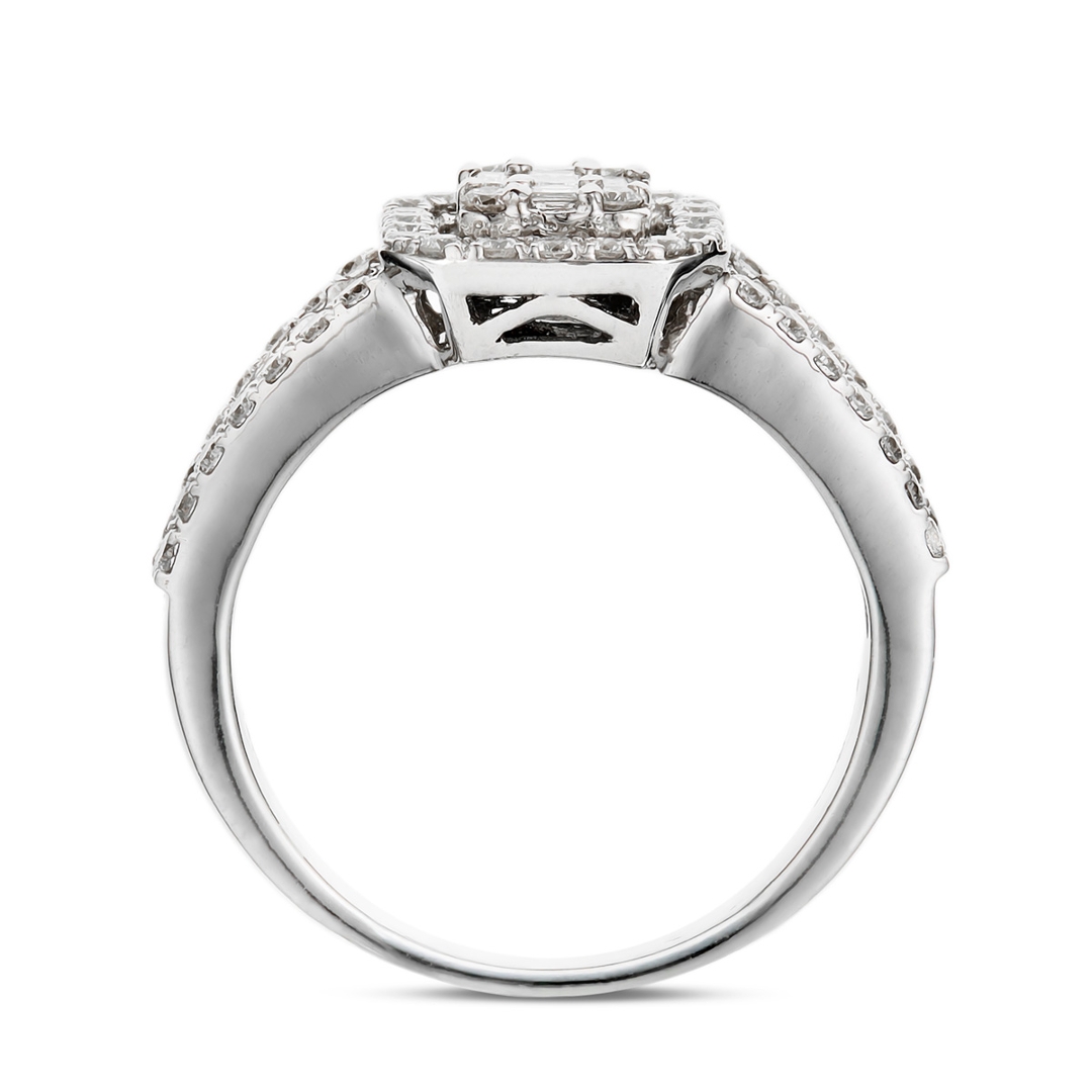 At the heart of the ring lies a meticulously crafted cluster of diamonds totalling 1.25 carats in weight. With their unique combination of baguette and brilliant cuts, these diamonds create a mesmerising display of light and sparkle, drawing all eyes to their radiant beauty.