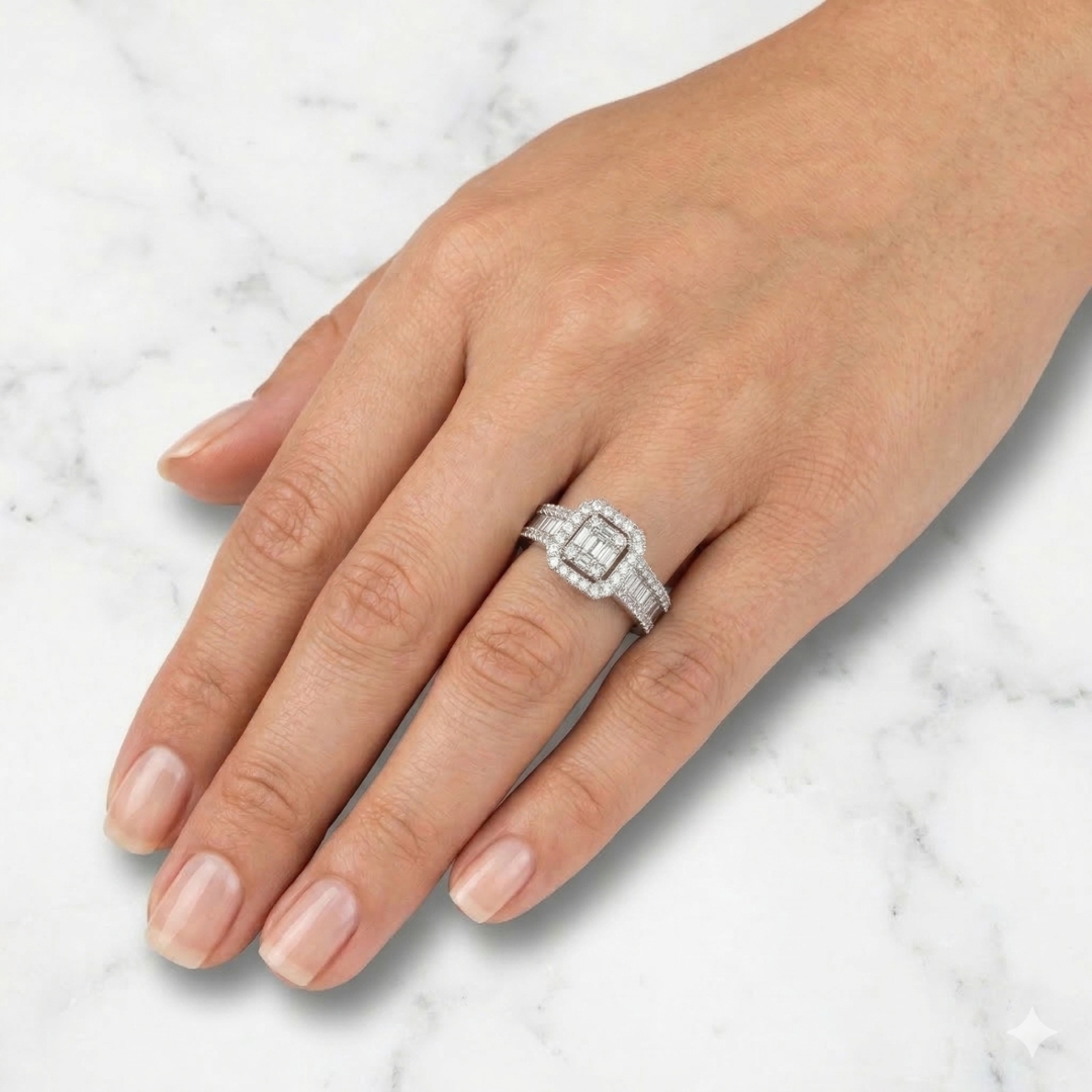 At the heart of the ring lies a meticulously crafted cluster of diamonds totalling 1.25 carats in weight. With their unique combination of baguette and brilliant cuts, these diamonds create a mesmerising display of light and sparkle, drawing all eyes to their radiant beauty.