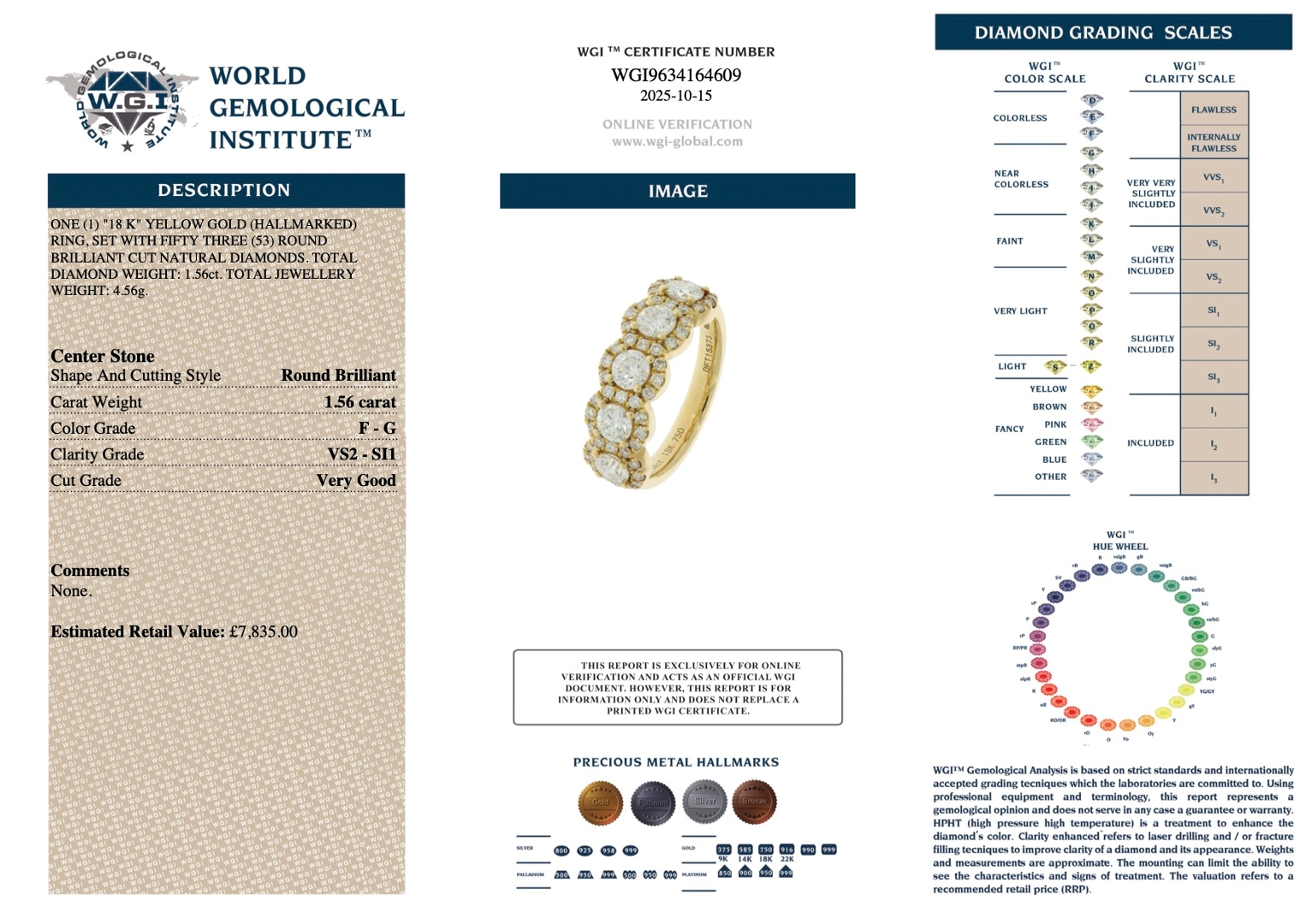 A brand-new, unused certified natural diamond cluster ring, expertly crafted in 18ct yellow gold. This elegant design features five brilliant-cut natural diamonds at the centre, surrounded by a dazzling halo of additional brilliant-cut diamonds that enhance its sparkle and presence. Together, the diamonds total 1.56 carats, with outstanding F-G colour and VS2–SI1 clarity, creating a captivating display of brilliance and fire. The warm glow of the yellow gold setting provides a beautiful contrast to the crisp, white sparkle of the diamonds, resulting in a timeless piece that radiates luxury and refinement from every angle.