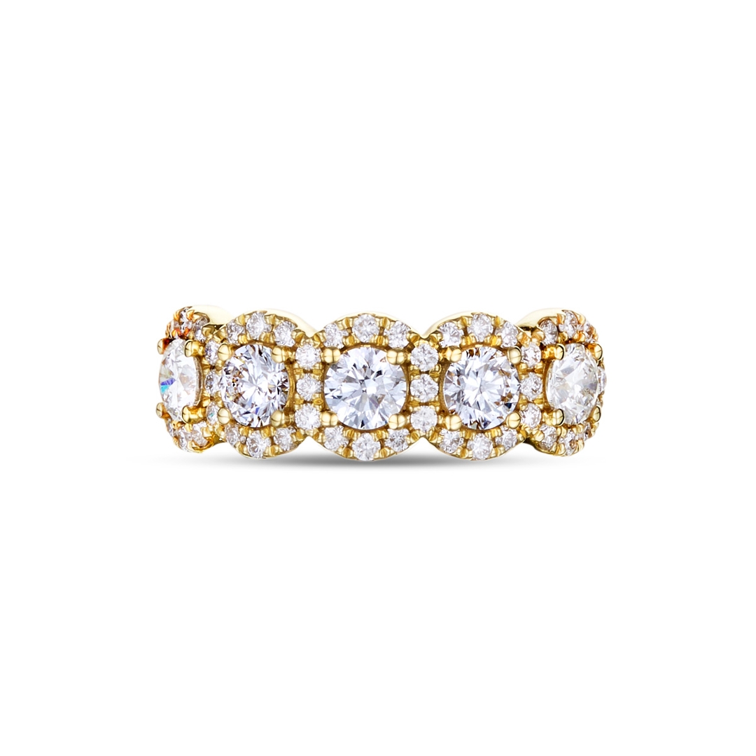 A brand-new, unused, certified natural diamond cluster ring, with five brilliant-cut diamonds to the centre & a cluster of brilliant-cut diamonds in a halo setting, set in 18ct yellow gold.