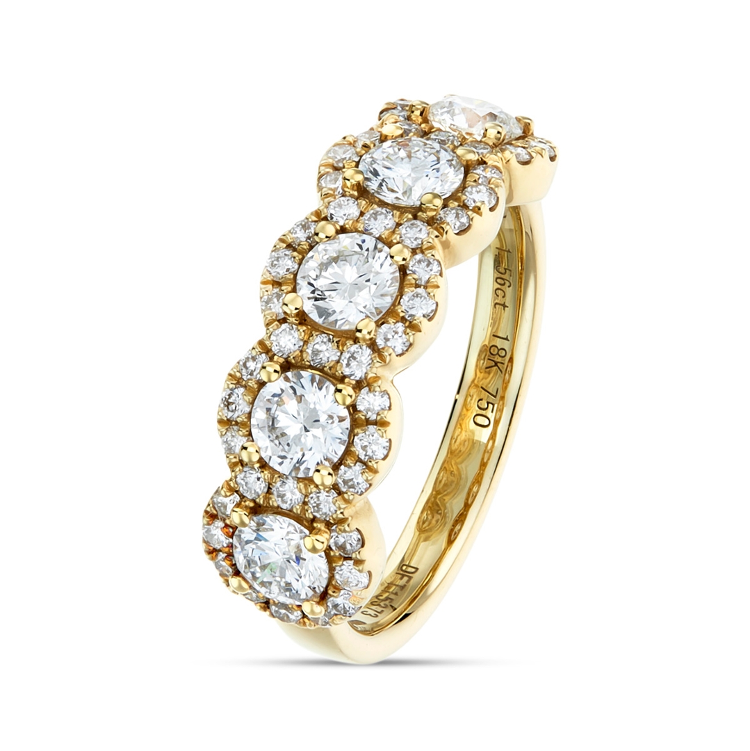 A brand-new, unused certified natural diamond cluster ring, expertly crafted in 18ct yellow gold. This elegant design features five brilliant-cut natural diamonds at the centre, surrounded by a dazzling halo of additional brilliant-cut diamonds that enhance its sparkle and presence. Together, the diamonds total 1.56 carats, with outstanding F-G colour and VS2–SI1 clarity, creating a captivating display of brilliance and fire. The warm glow of the yellow gold setting provides a beautiful contrast to the crisp, white sparkle of the diamonds, resulting in a timeless piece that radiates luxury and refinement from every angle.