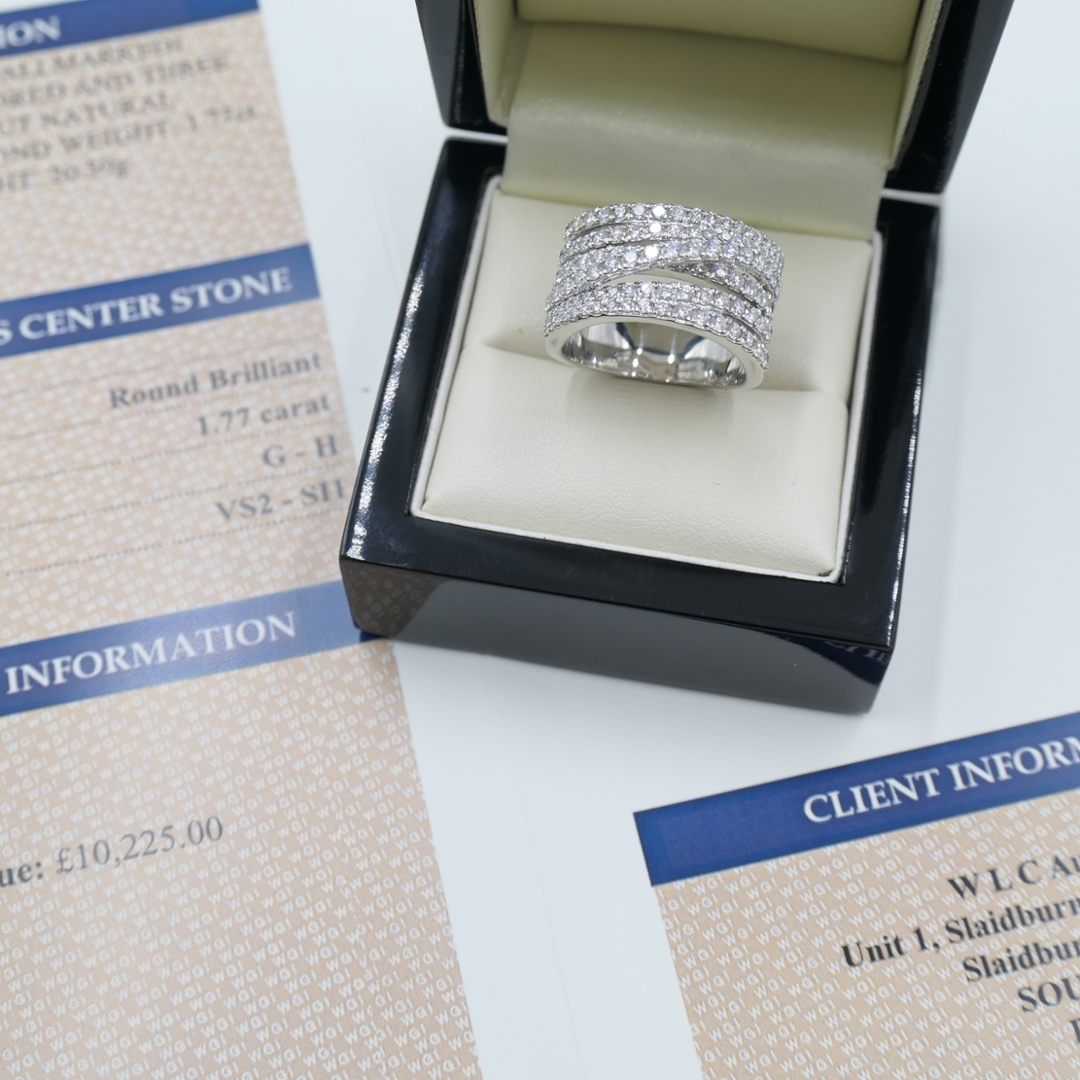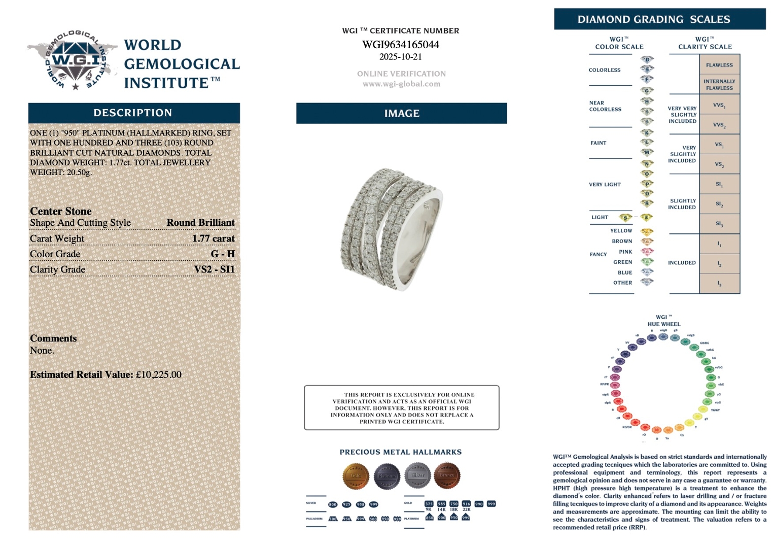 A brand-new, unused certified natural diamond cluster ring that embodies power, brilliance and enduring sophistication. This impressive piece is set with a dazzling cluster of brilliant-cut natural diamonds, totalling 1.77ct, carefully selected for their symmetry, fire and radiance. The diamonds are graded G–H in colour and VS2–SI1 in clarity, offering an exceptional balance of purity and sparkle. Expertly crafted in platinum, a metal celebrated for its strength, rarity and timeless lustre, this substantial ring — weighing 20.50 grams — exudes both luxury and presence. Every facet reflects masterful craftsmanship and refined design, with a professional valuation of £10,225 underscoring its exceptional quality and prestige.