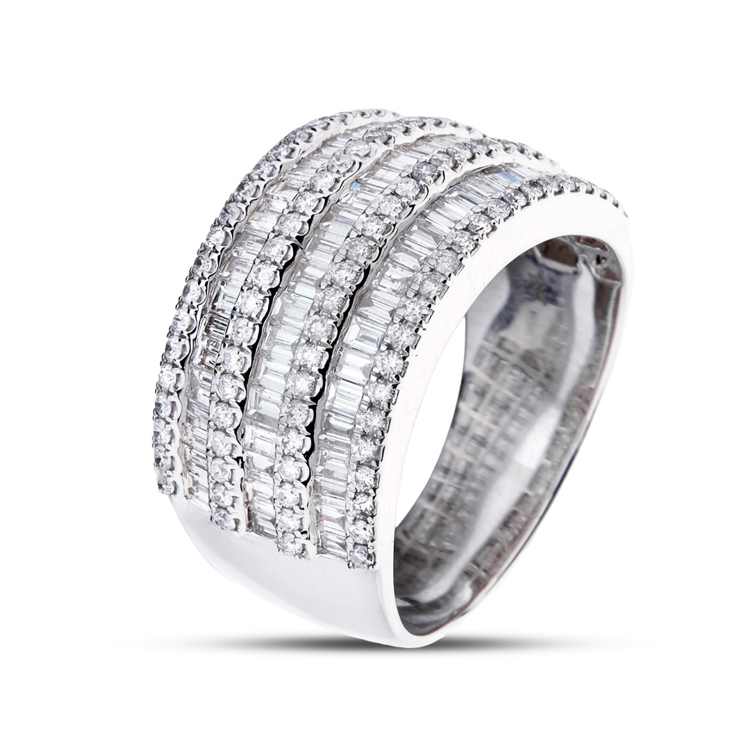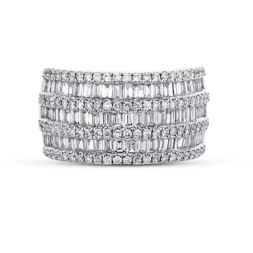 Crafted from 18ct white gold, the metal setting provides a sleek and modern backdrop for the stunning diamonds. Combining baguette-cut and brilliant-cut diamonds creates a captivating contrast, adding depth and dimension to the ring's design.