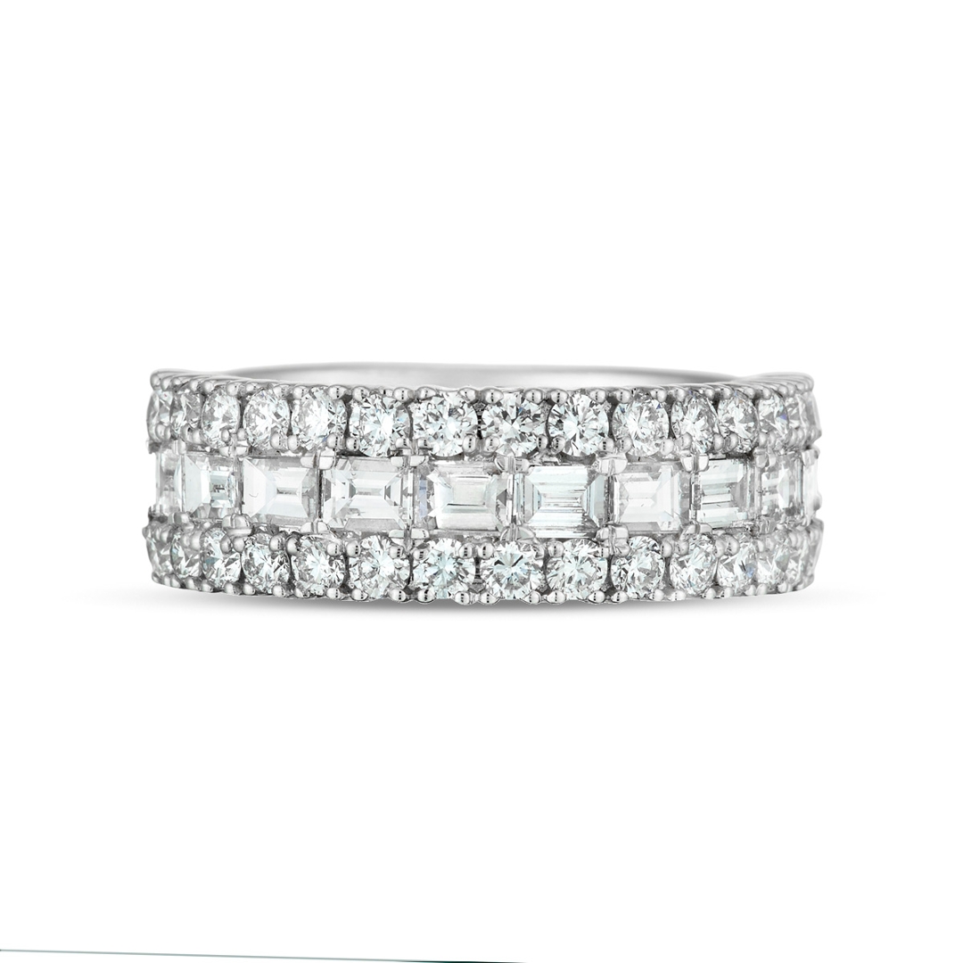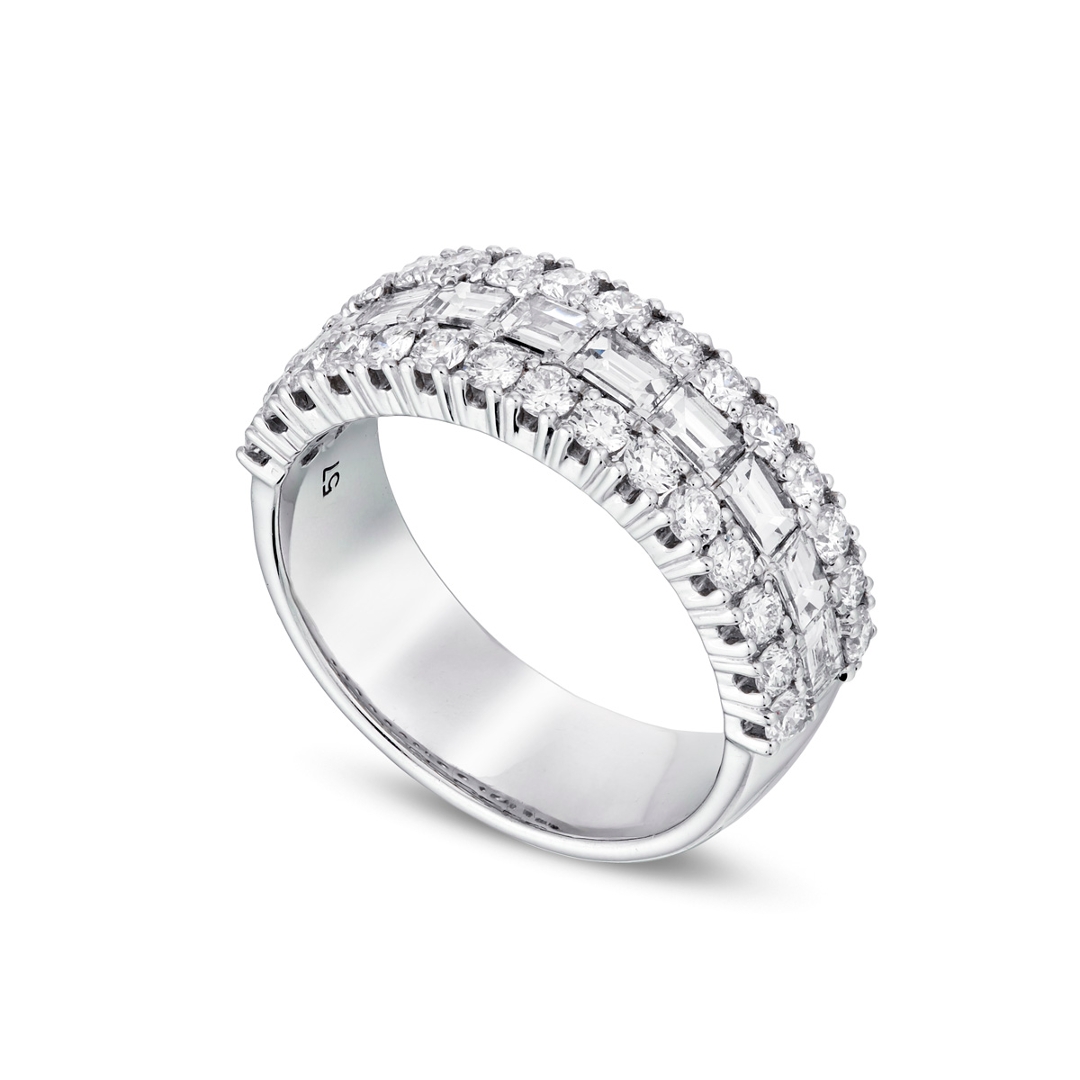 A brand-new, unused certified natural diamond cluster ring, set with a combination of baguette-cut and brilliant-cut diamonds in 9ct white gold. With an impressive total diamond weight of 2.23 ct, the design brings together clean, linear facets and lively sparkle, creating a bold and well-structured display of light across the finger. The white gold setting enhances overall brightness, providing a crisp, contemporary finish that complements the arrangement beautifully.