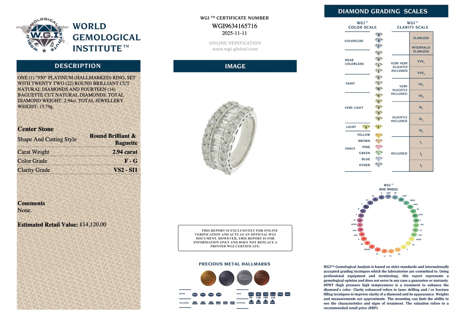 A brand-new, unused certified natural diamond cluster ring that showcases an impressive blend of structure, brilliance and refined luxury. Set with a striking combination of baguette-cut and brilliant-cut natural diamonds totalling 2.94ct in F–G colour and VS2–SI1 clarity, the ring delivers a dynamic display of light as the contrasting cuts work together to create depth, sparkle and architectural elegance. The baguette diamonds contribute clean, linear flashes, while the brilliant cuts add lively fire, resulting in a sophisticated cluster that feels bold yet beautifully balanced. These natural diamonds not only elevate the ring’s visual impact but also reflect the strong appreciation collectors continue to show for earth-formed stones, prized for their rarity, authenticity and enduring desirability. With global supply tightening and demand for natural diamonds remaining consistently high, jewellery set with certified natural stones carries notable long-term investment potential, making pieces of this calibre particularly appealing for both their beauty and future value.