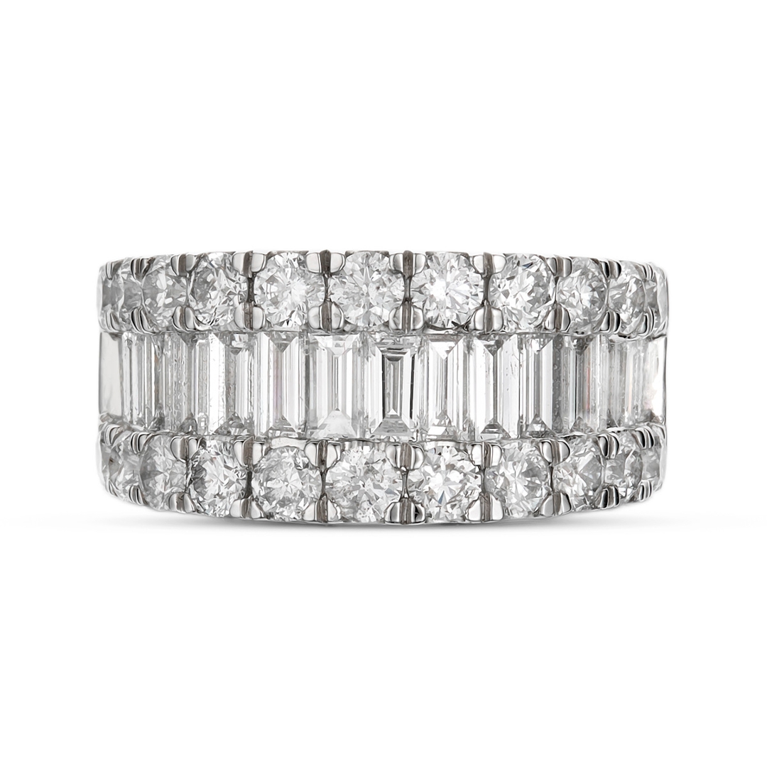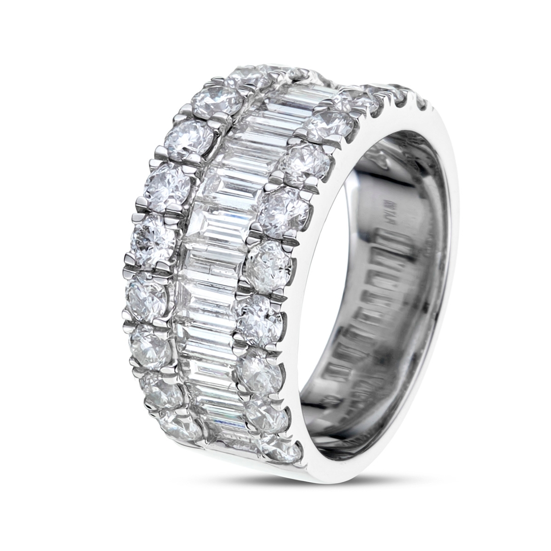 The ring's design masterfully blends elegance and luxury, with the platinum setting providing a durable and lustrous backdrop that accentuates the diamonds' radiance. The combination of baguette and brilliant-cut diamonds creates a captivating visual contrast, with the baguette cuts adding a sleek, linear sophistication and the brilliant cuts contributing a scintillating shimmer. This harmonious blend of diamond cuts results in a unique and eye-catching design that stands out in any collection.