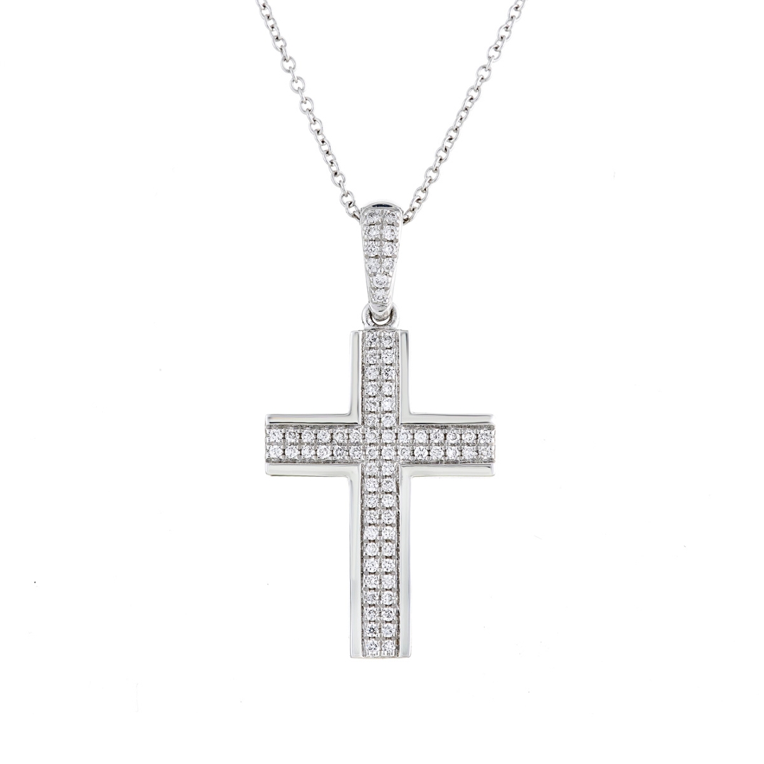 A brand new, unused certified 18ct white gold natural diamond cross pendant, set with a cluster of brilliant cut diamonds.