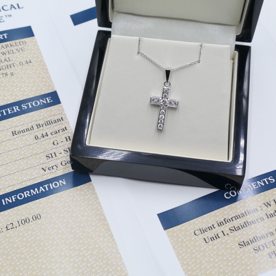 The craftsmanship and design of these pendants further enhance their investment appeal. Their cross-shaped design, adorned with brilliant-cut diamonds, exudes spiritual significance and timeless elegance. The 18ct white gold setting adds to their allure, highlighting their intrinsic value as precious metal jewellery.