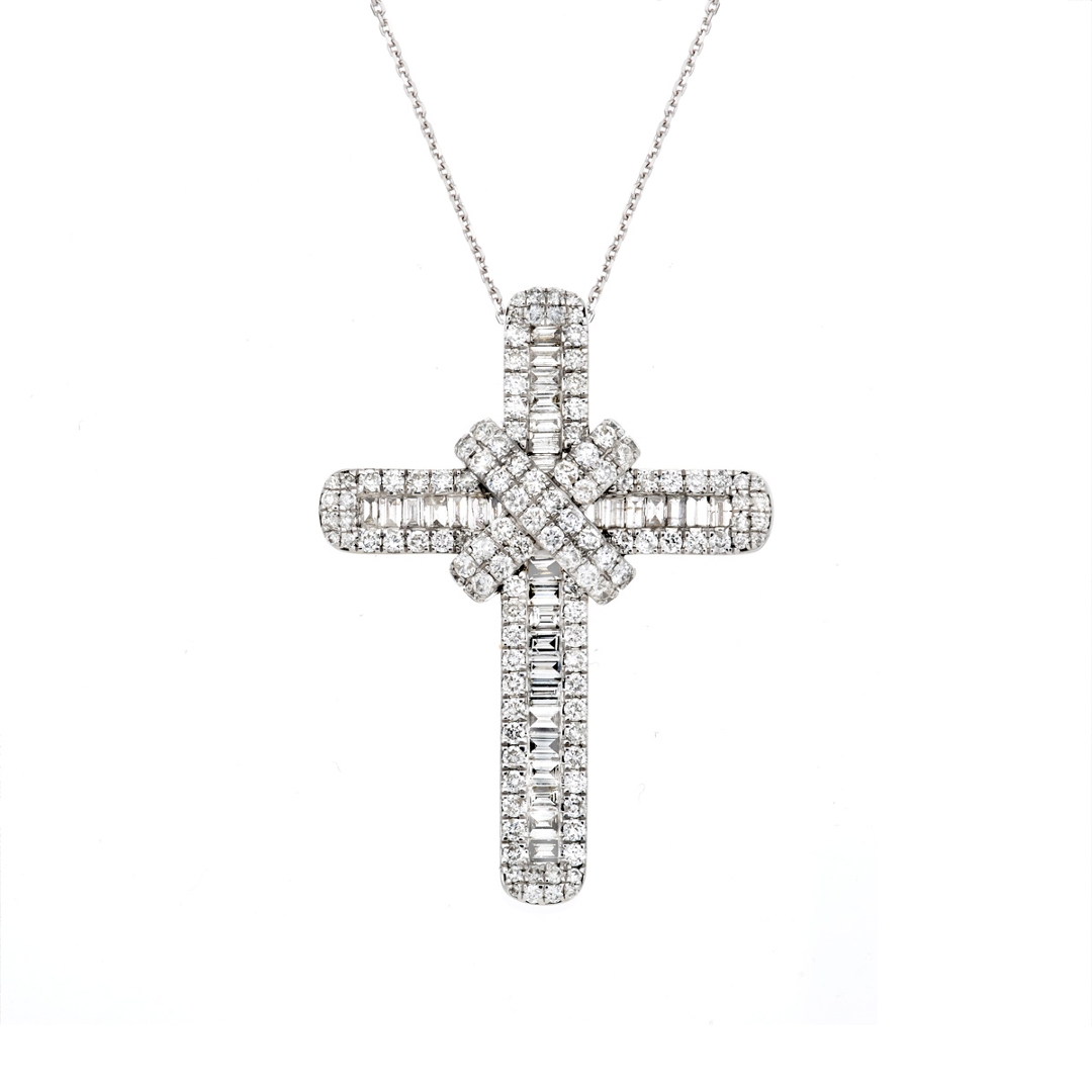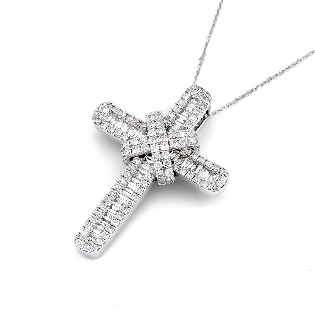 A brand-new, unused 9ct white gold pendant showcasing a striking cross design, beautifully set with a captivating arrangement of baguette-cut and brilliant-cut natural diamonds. With a weight of 7.27 grams. Totalling an impressive 2.15 carats, the diamonds exhibit exceptional G–H colour and a clarity range of VS2–SI2, creating a breathtaking fusion of radiance and precision. The geometric baguette cuts lend structure and symmetry, while the brilliant cuts add intense fire and sparkle, resulting in a pendant that commands admiration from every angle. The luminous white gold enhances the diamonds’ natural brightness, giving this piece a sophisticated and timeless presence.