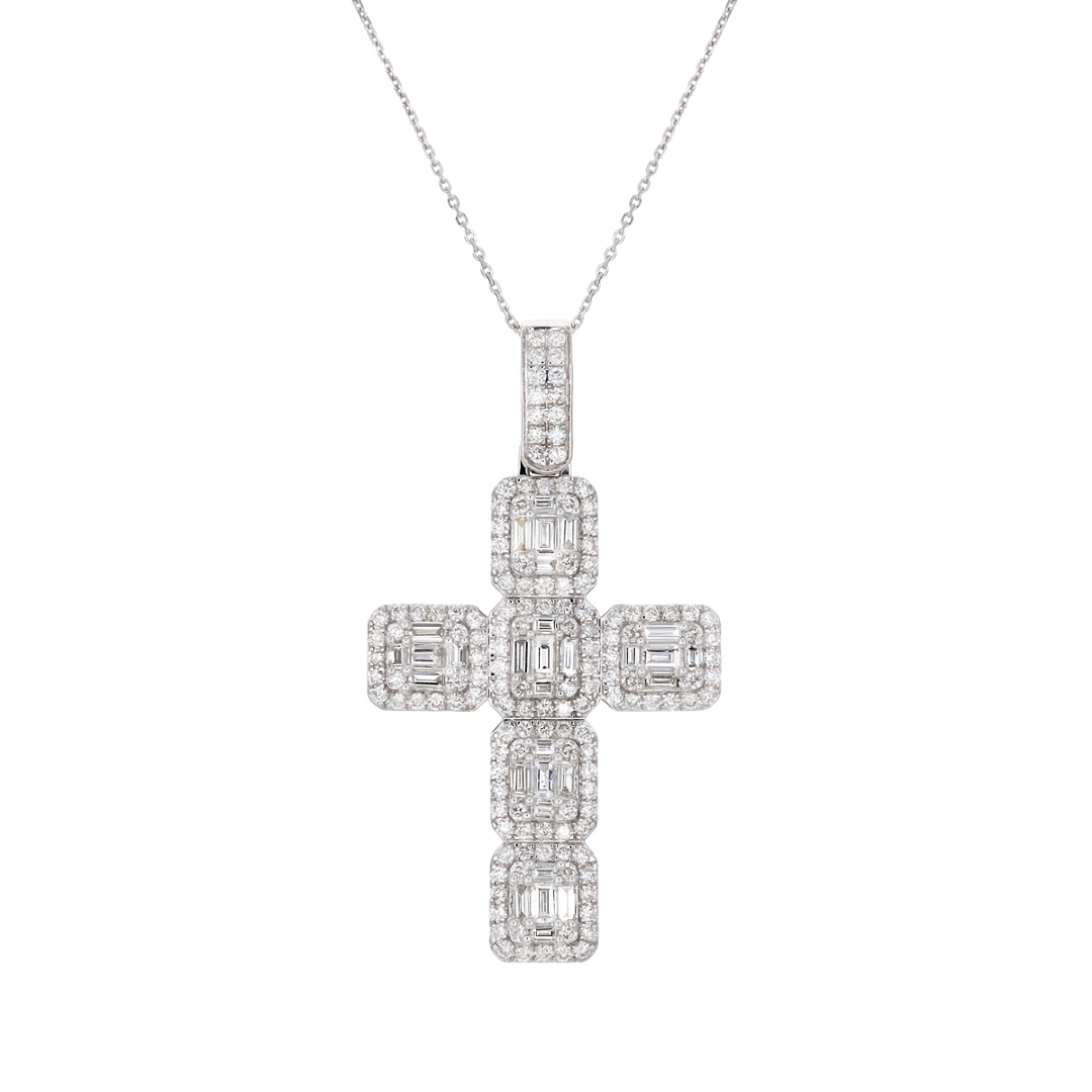A brand-new, unused, certified natural diamond cross pendant, set with a cluster of baguette-cut & brilliant cut diamonds, set in 9ct white gold.