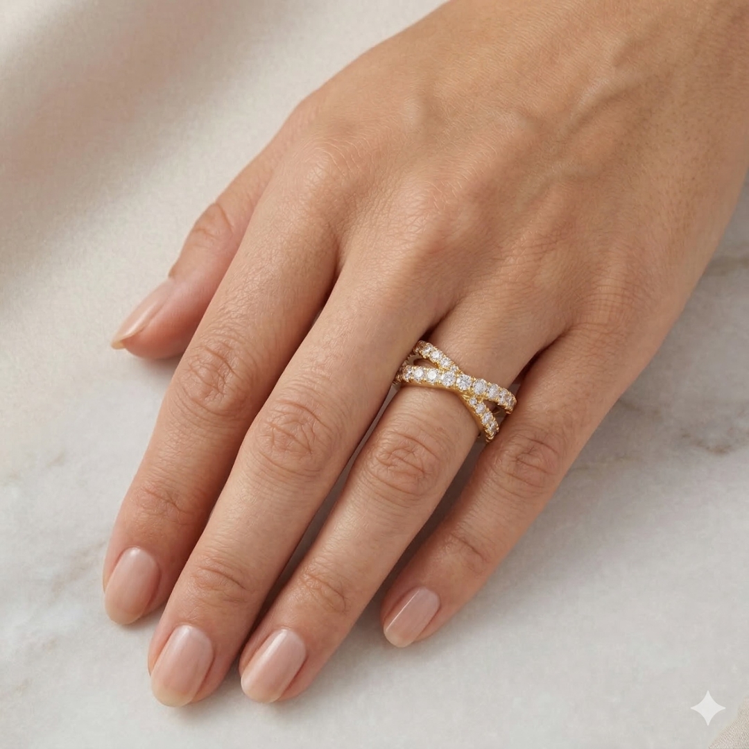 The graceful crossover design adds a contemporary touch to this classic style, its flowing curves symbolising unity and eternal love. The warm tones of the yellow gold beautifully complement the pure, white brilliance of the diamonds, creating a striking contrast that feels both sophisticated and timeless. Every element has been carefully crafted for balance, comfort, and elegance, resulting in a piece that is as wearable as it is eye-catching.