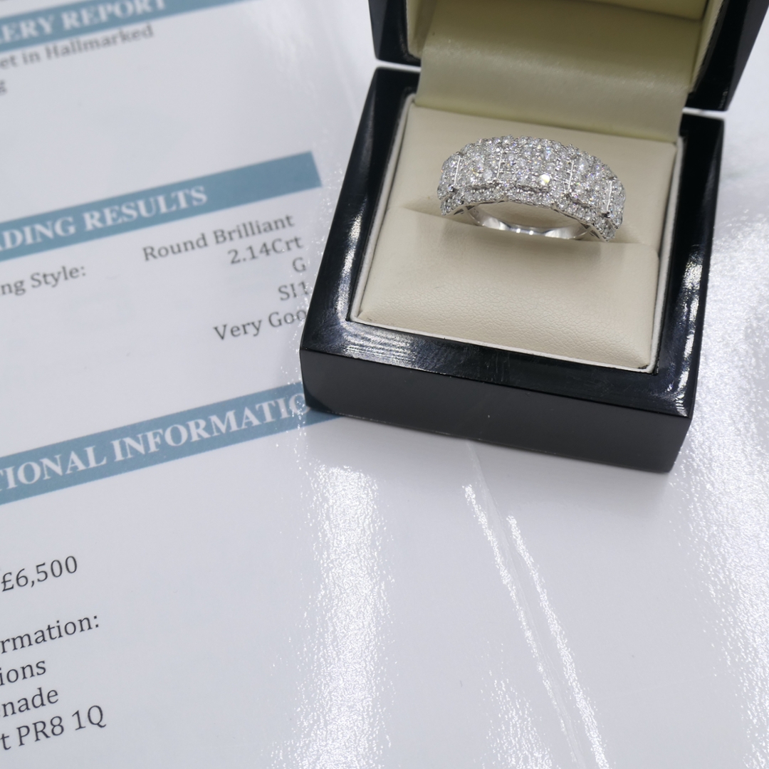 Crafted in 9ct white gold, this ring exudes understated luxury and elegance, making it a cherished addition to any jewellery collection. With a valuation of £6,500.00, it symbolises enduring love and is a valuable investment in exquisite craftsmanship and exceptional beauty.