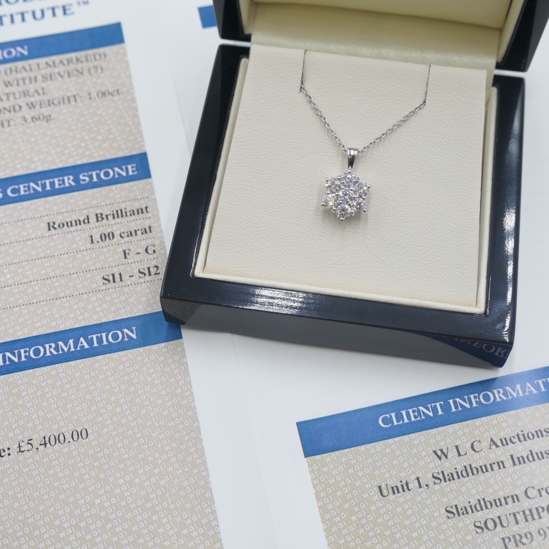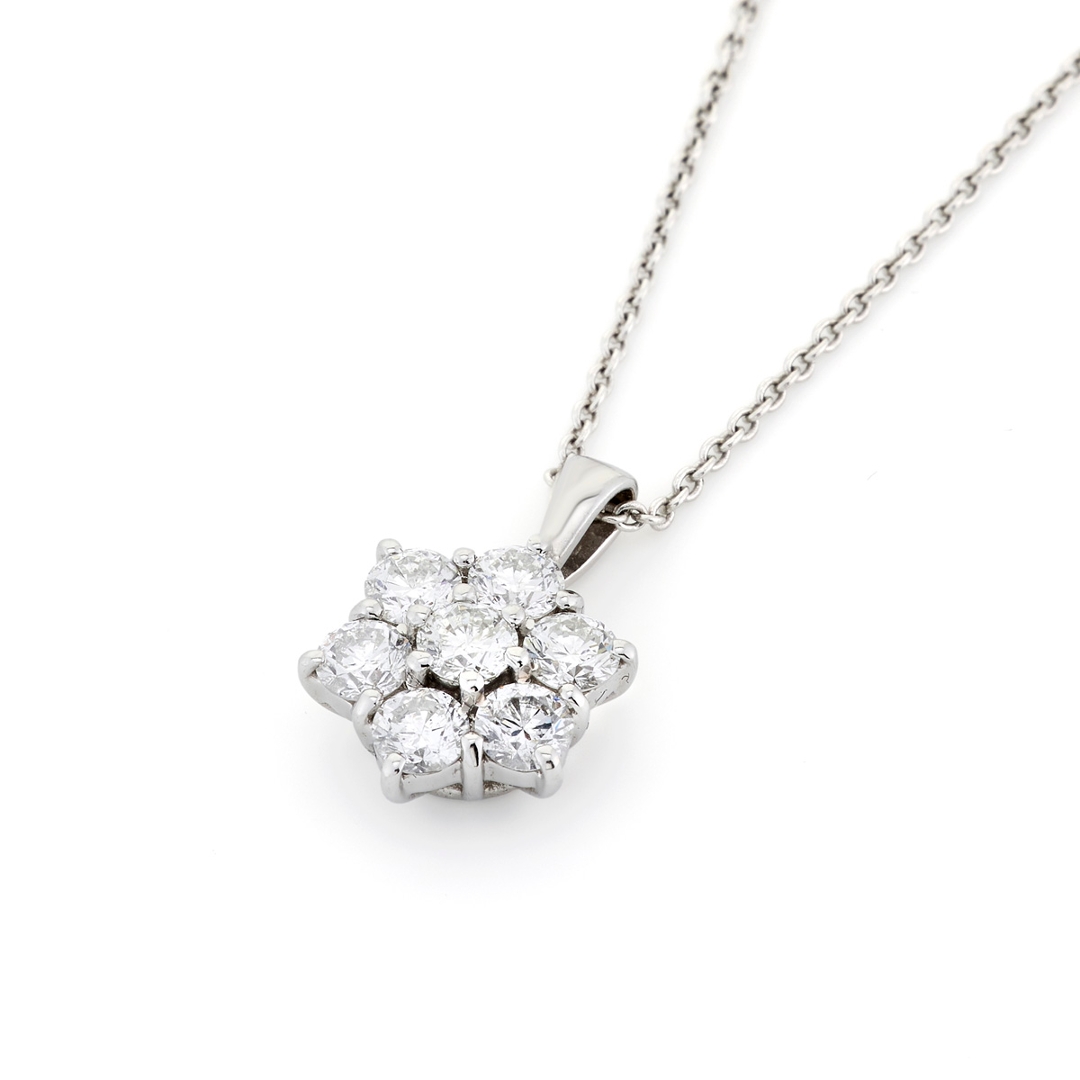 A brand-new, unused certified 18ct white gold natural diamond daisy-shaped cluster pendant, expertly crafted to combine stunning brilliance with a timeless, elegant design. This luxurious piece features seven brilliant-cut natural diamonds, totalling 1.00ct, each selected for SI1-SI2 clarity and F-G colour, for a sparkling, radiant display. The daisy shape is beautifully realised, with each diamond arranged to resemble delicate petals, creating a sophisticated yet playful look. The polished white gold setting complements the diamonds’ natural sparkle, allowing them to catch the light with every movement, making this pendant a captivating addition to any jewellery collection.