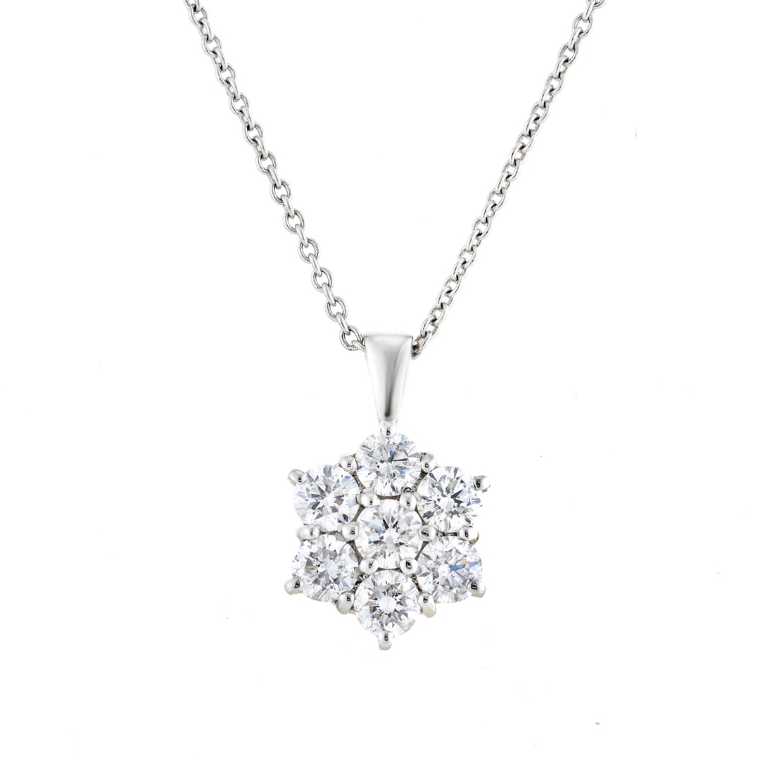 A brand-new, unused, certified 18ct white gold natural diamond daisy-shaped cluster pendant, set with seven brilliant-cut diamonds.