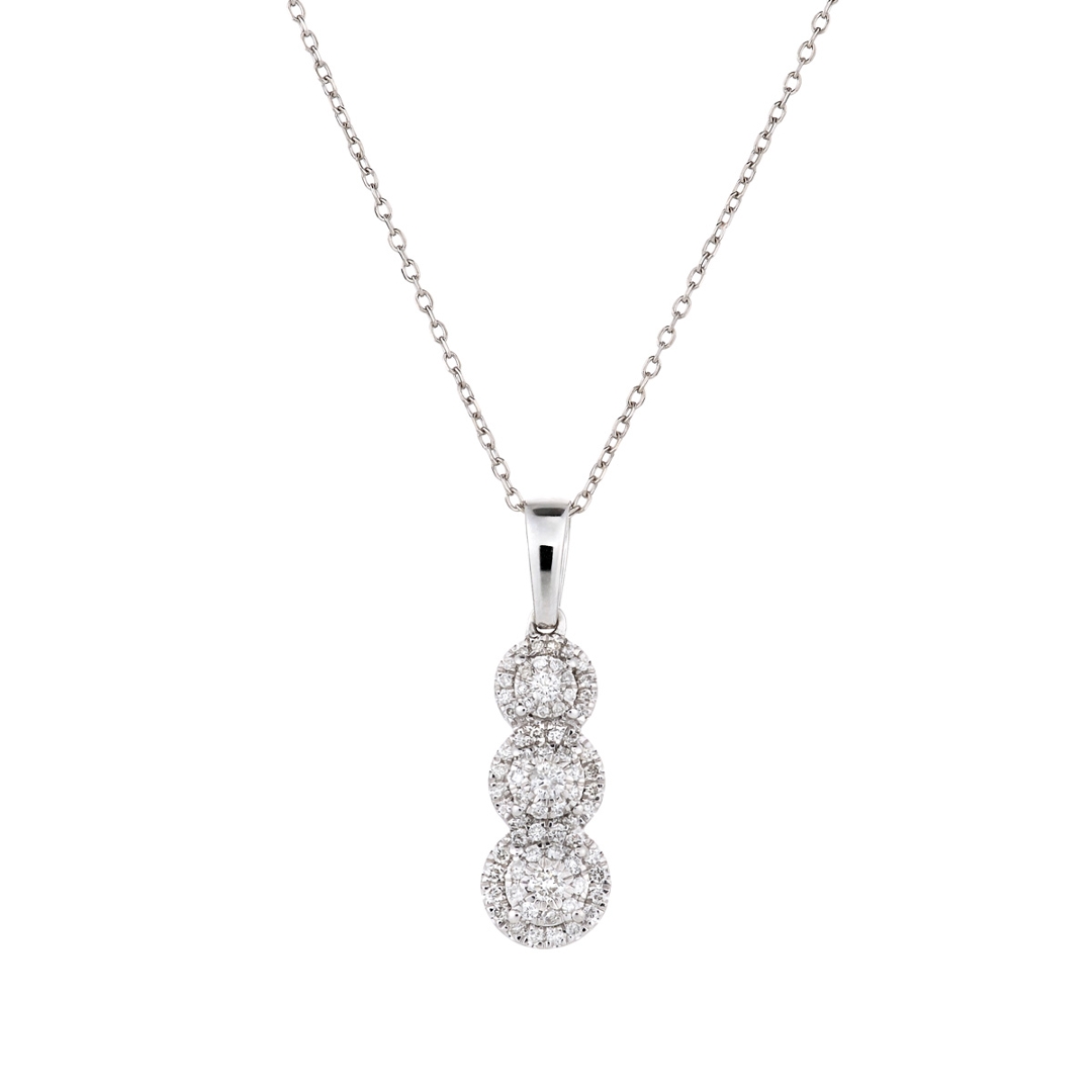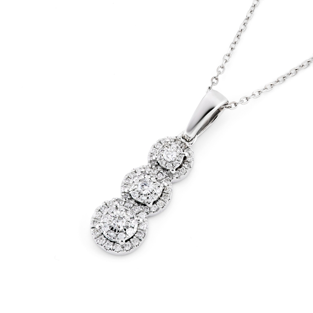 A brand-new, unused certified 18ct white gold natural diamond droplet pendant, beautifully designed with an elegant cascade of brilliant-cut natural diamonds totalling 0.33 carats. Each diamond radiates exceptional sparkle, carefully graded F–G in colour and SI1–SI2 in clarity, creating a dazzling brilliance against the luminous white gold setting. The triple-droplet design flows gracefully, capturing light from every angle and offering a refined expression of timeless sophistication. This pendant perfectly balances contemporary elegance with classic allure, making it an exquisite addition to any fine jewellery collection.