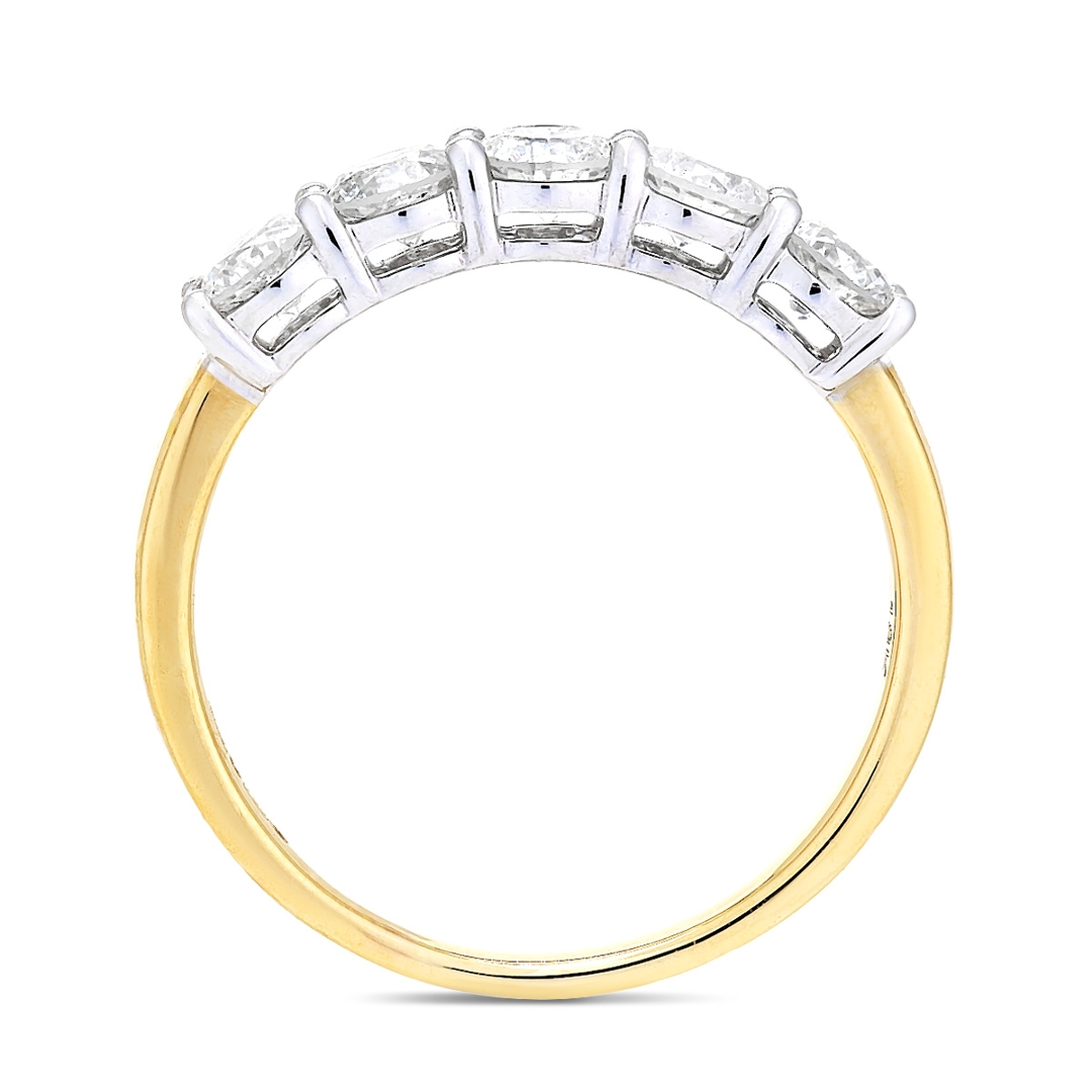 A brand-new, unused certified natural diamond five-stone eternity ring, set with five brilliant-cut diamonds in a refined combination of 18ct yellow and white gold. With a total diamond weight of 0.98 ct, the evenly spaced stones create a bright, continuous line of brilliance, offering a strong visual presence while maintaining a balanced and elegant profile. The contrast between the warm yellow gold and the white settings enhances each diamond, adding depth and definition to the overall design.