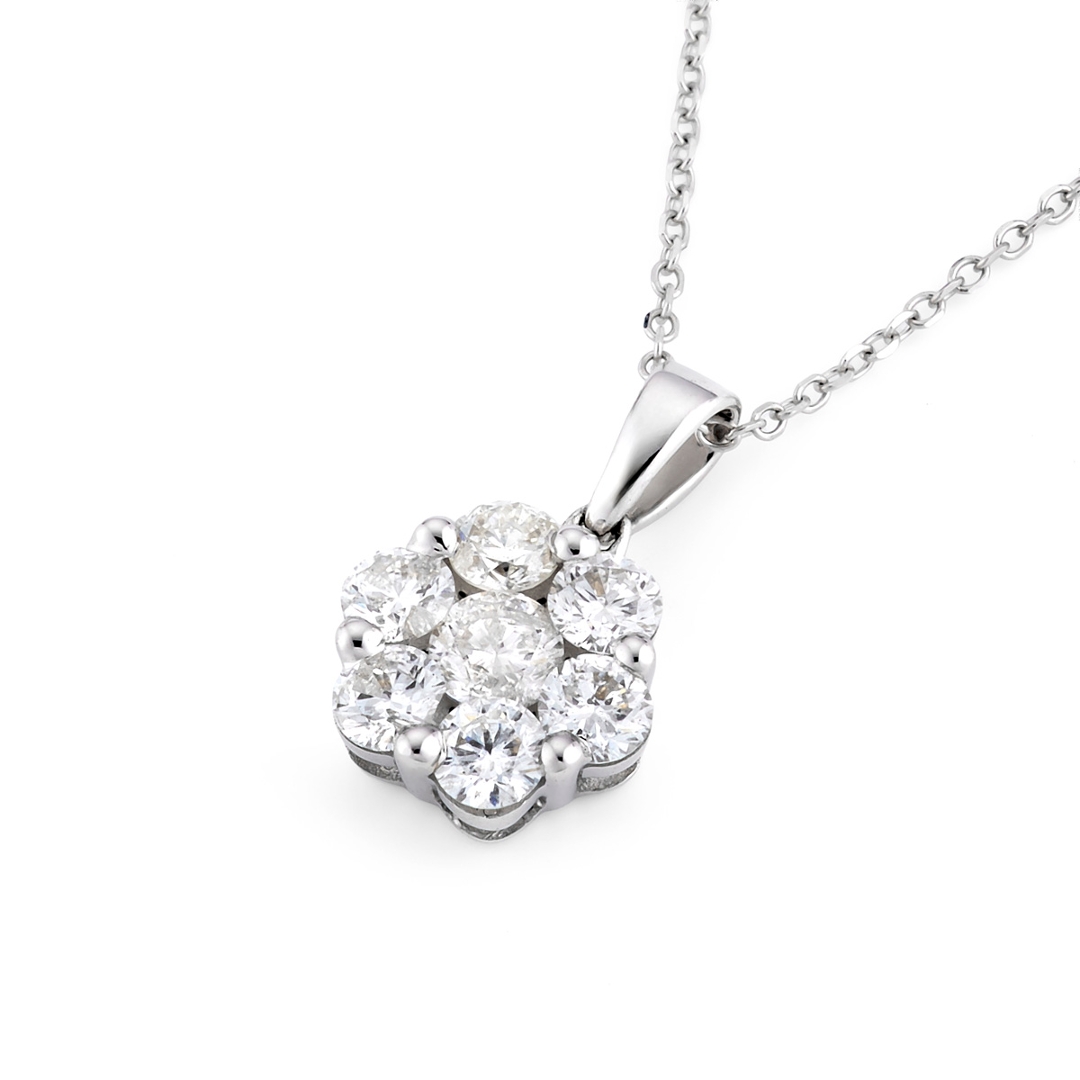 A brand-new, unused, certified 18ct white gold natural diamond flower-shaped pendant, exquisitely set with seven round brilliant-cut natural diamonds totalling 1.00 carat. The meticulously matched stones, graded G–H in colour and SI1–SI2 in clarity, form a radiant floral cluster that glimmers with refined elegance. The pendant’s harmonious symmetry and luminous sparkle reflect the superior craftsmanship behind its design, while the white gold setting enhances the natural brilliance of each diamond, creating a timeless and luxurious appearance.