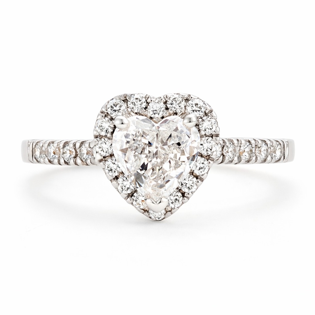A brand-new, unused certified natural diamond solitaire engagement ring that radiates romance and refined beauty. At its centre lies a stunning 1.01-carat heart-cut natural diamond, graded G in colour and SI2 in clarity, symbolising love and devotion through its enchanting shape and captivating brilliance. Surrounding the centre stone is a halo of brilliant-cut diamonds, with additional diamonds set along the shoulders for added sparkle and dimension. These accent stones total 0.31 carats and are graded G–H in colour and VS–SI in clarity, enhancing the central diamond’s radiance and creating a dazzling display of fire and light.