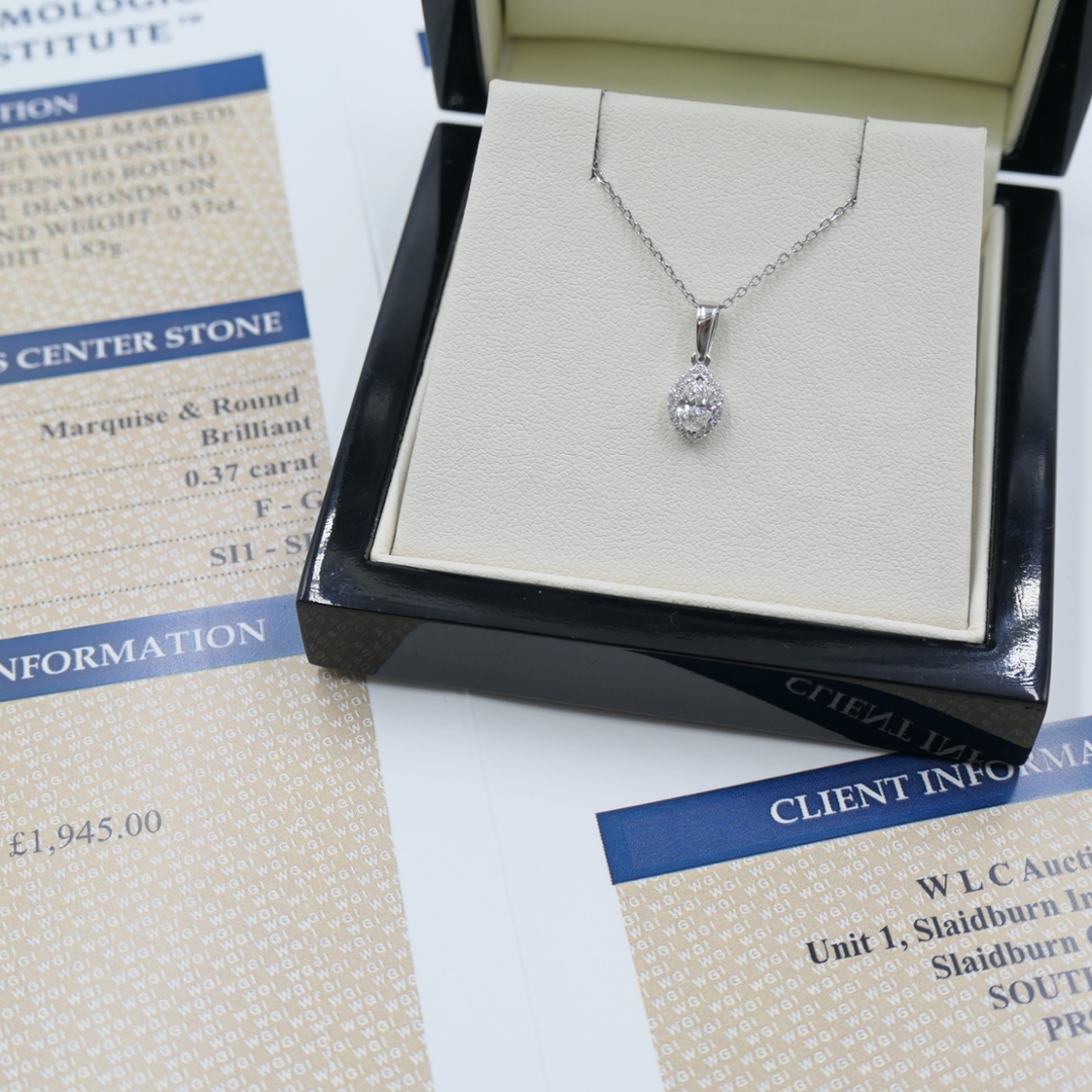 A brand-new, unused certified 18ct white gold natural diamond marquise-shaped cluster pendant, showcasing a striking marquise-cut diamond at its centre, surrounded by a halo of sixteen brilliant-cut diamonds. With a total diamond weight of 0.37 carats, this pendant radiates refined sparkle and sophistication. The F–G colour and SI1–SI2 clarity ensure a bright, lively appearance that captures the light beautifully from every angle. Weighing 1.83 grams. The marquise cut, renowned for its elegant, elongated silhouette, gives the pendant a graceful, feminine shape that flatters the neckline with timeless appeal.