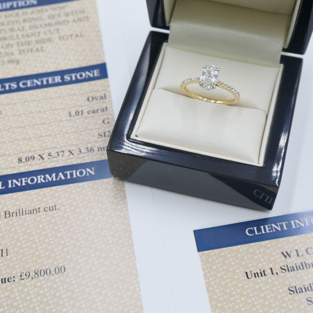 A brand-new, unused certified platinum and 18ct yellow gold solitaire engagement ring, crafted to emphasise the natural beauty of diamonds in a refined and elegant design. At its centre is an oval-cut diamond weighing 1.01 carats, graded SI2 clarity and G colour, with a graceful shape that reflects light beautifully. The shoulders are adorned with a cluster of brilliant-cut diamonds totalling 0.21 carats, graded between VS2 and SI1 clarity and F–G colour, enhancing the sparkle of the central stone and completing the ring with balance and sophistication. The contrast of platinum with yellow gold adds both strength and warmth, ensuring the ring carries timeless appeal.
