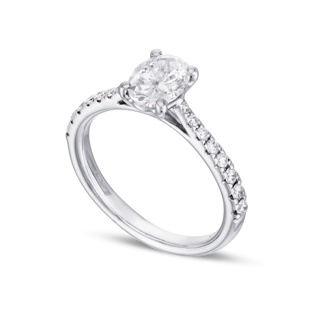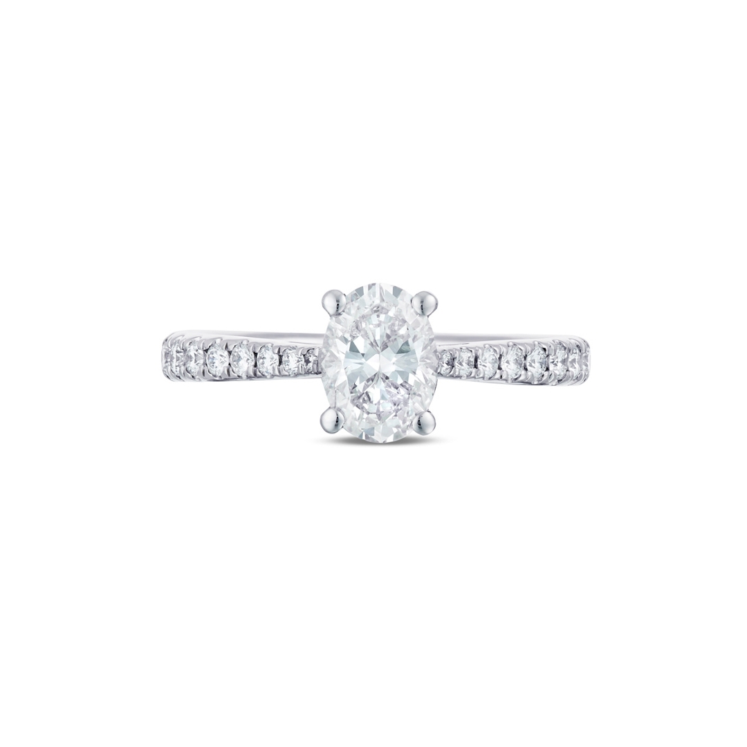 A brand-new, unused certified natural diamond solitaire engagement ring, set with a graceful 1.01ct oval-cut diamond at the centre, enhanced by a refined cluster of brilliant-cut diamonds along the shoulders, all crafted in 18ct white gold. The centre stone displays an I colour, offering a soft warmth balanced by lively brilliance, while its VS2 clarity ensures a clean and visually appealing appearance. The shoulder diamonds, totalling 0.25 ct, feature higher F–G colour and VS2–SI1 clarity, adding a bright, crisp contrast that elevates the ring's overall sparkle.