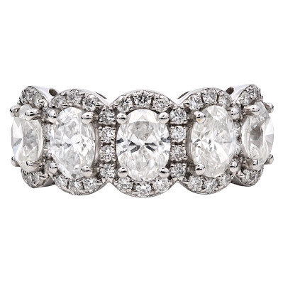 A brand-new, unused, certified natural diamond oval-shaped cluster ring, with five oval-cut diamonds to the centre & a cluster of brilliant-cut diamonds in a halo setting, set in platinum.